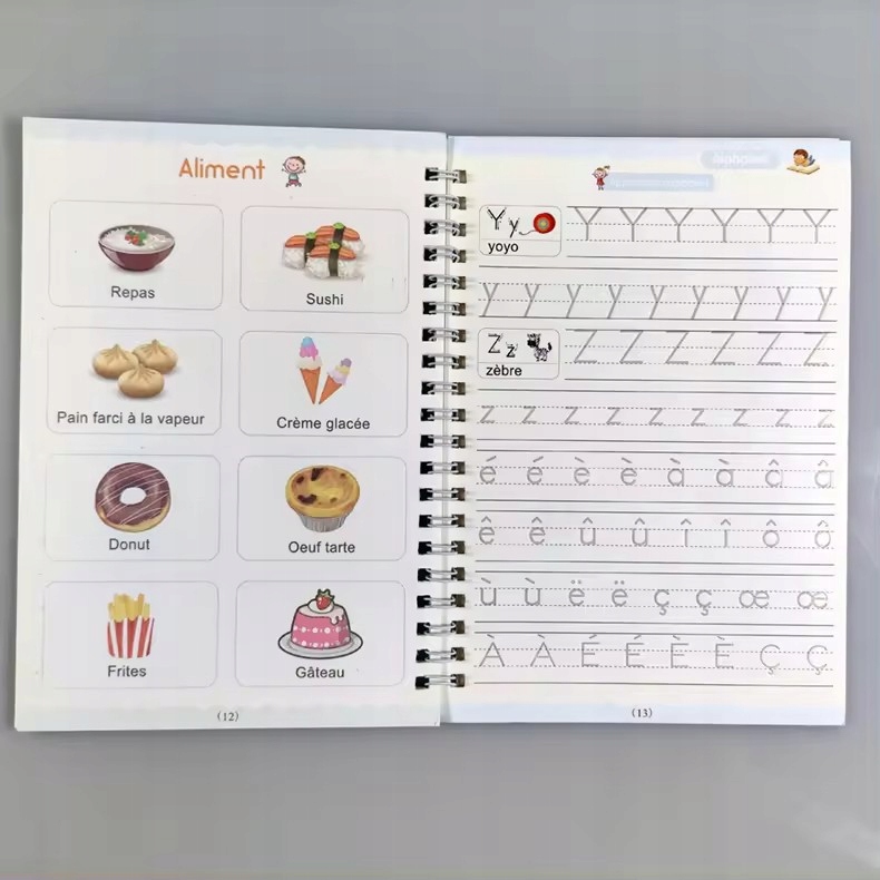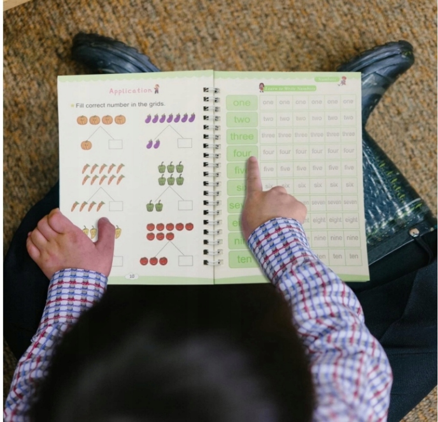 тетрадь имеют три -мерные канавки, благодаря тому, что ребенок учится правильно писать. Держатель пера помогает обучить способность ручки держать ручку, чтобы ребенок больше не испачкал его руки чернилами. Фрукты были разработаны и сделаны из высококачественных материалов, которые безопасны для ребенка и окружающей среды