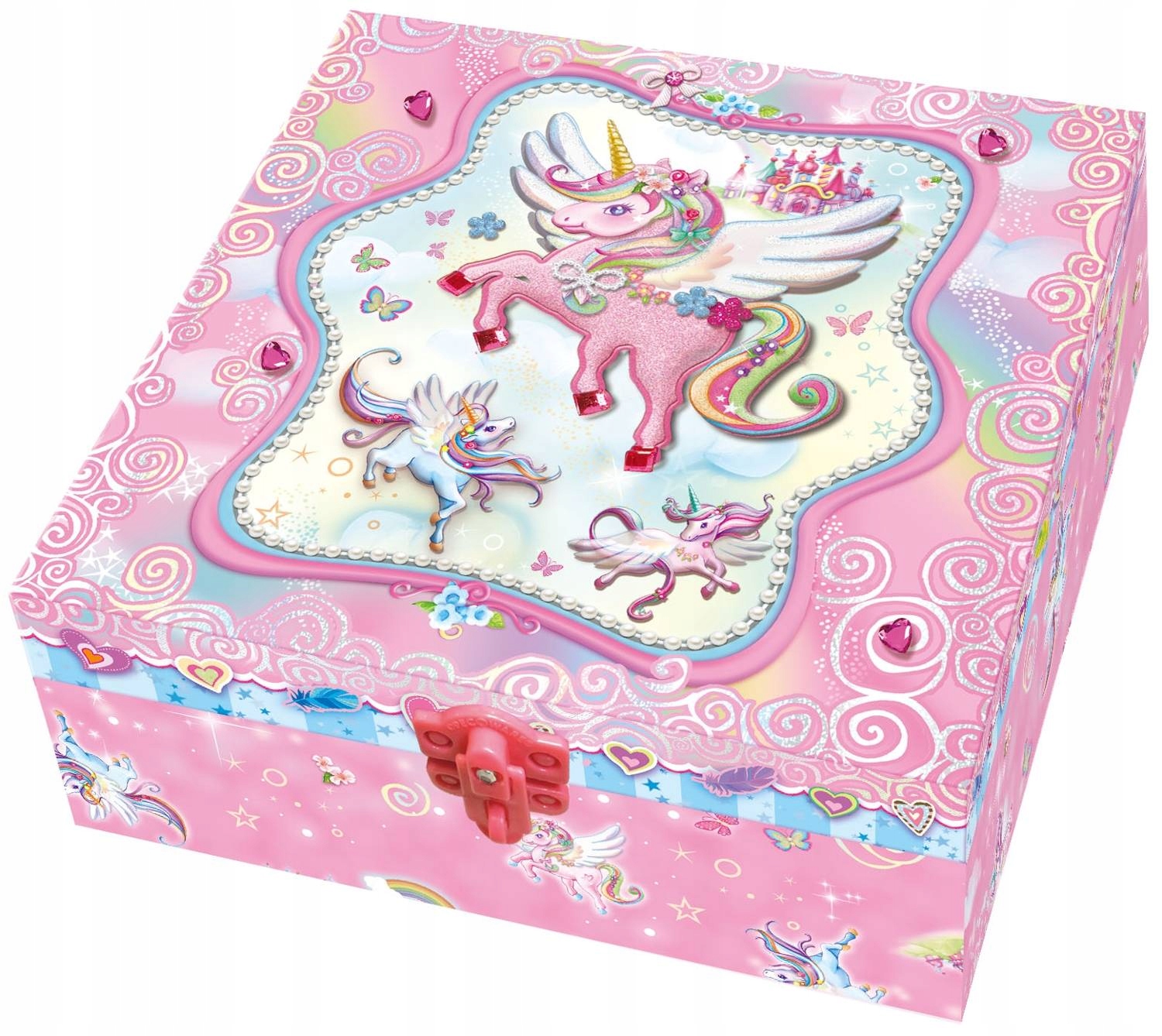 Декоративная шкатулка с единорогом – уникальная и очаровательная вещь. Две раскладывающиеся в стороны полки вашей шкатулки позволят всем элегантным девушкам хранить украшения и другие ценные сокровища. Внутри коробки маленькая принцесса найдет потрясающий набор!