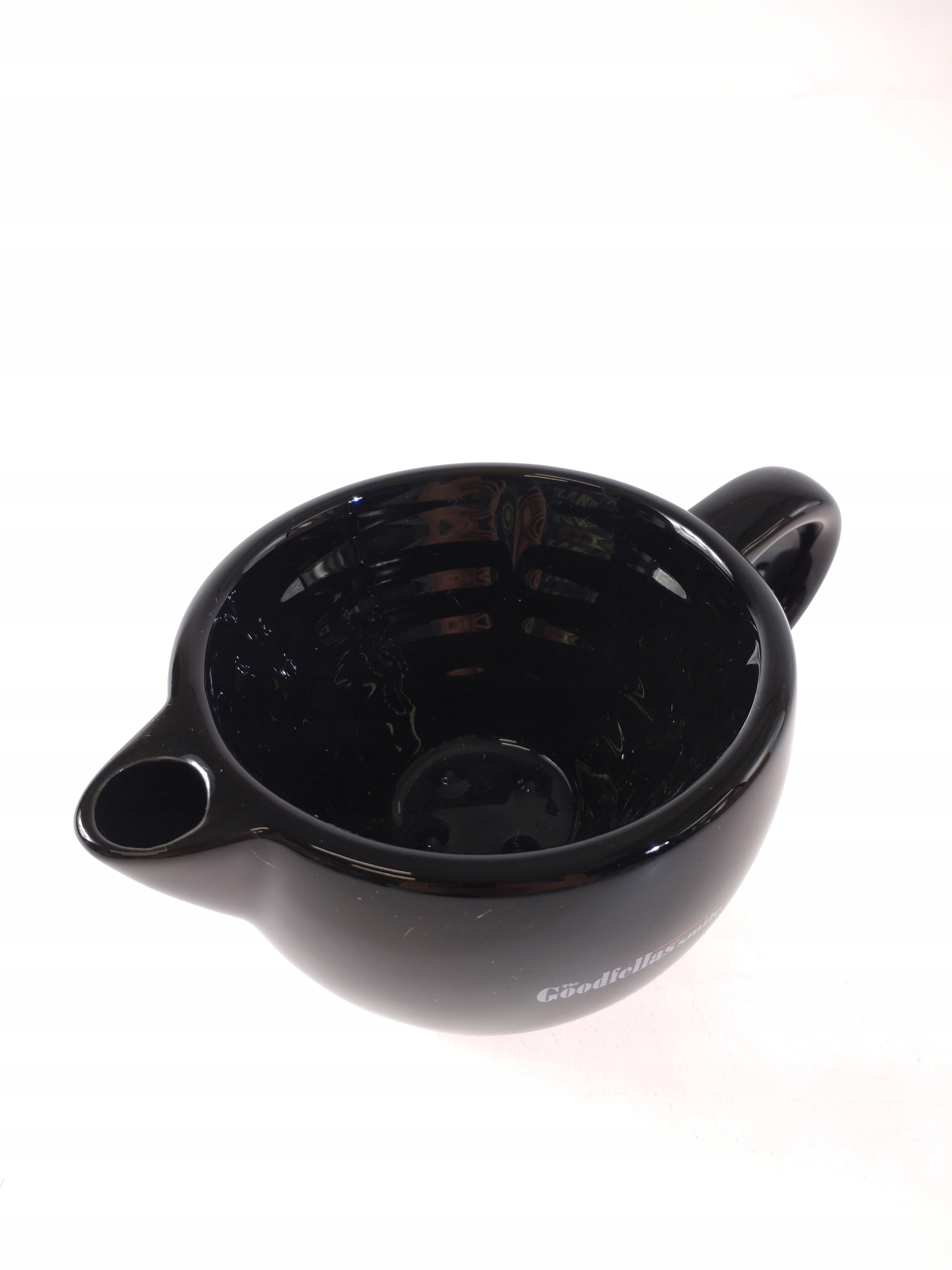Керамическая чаша для бритья Гудфеллас Smileble Smicetle Black Ceramic Bowling Mowl The Goodfellas Smile Smileble Black с ручкой для более надежного удержания. Двойное дно позволяет вставить горячую воду, чтобы поддерживать правильную температуру мыла во время монтажа, чтобы получить богатую, твердую и бархатную пену.