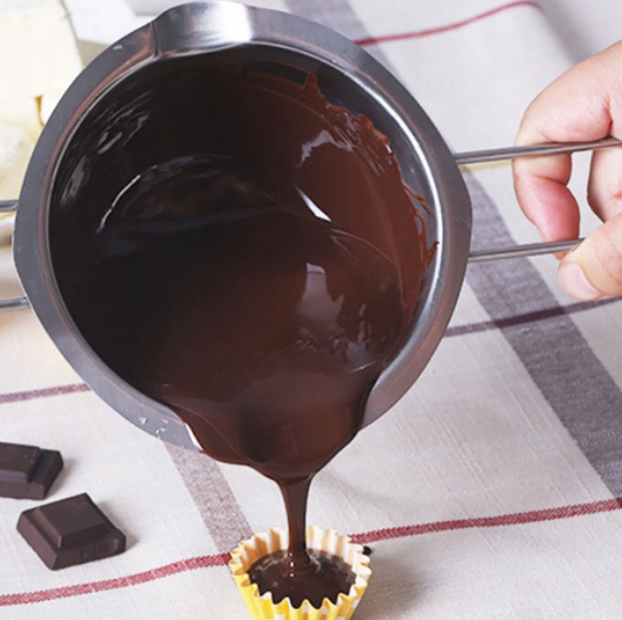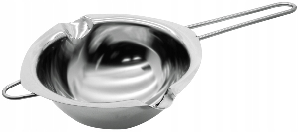 Чаша с водяной баней идеально подходит для растворения соевого воска, который не следует подвергать воздействию слишком высоких температур. Чаша изготовлена из нержавеющей стали, имеет два носика и одну длинную ручку. В чаше также можно растопить шоколад, масло или взбить горячее безе.