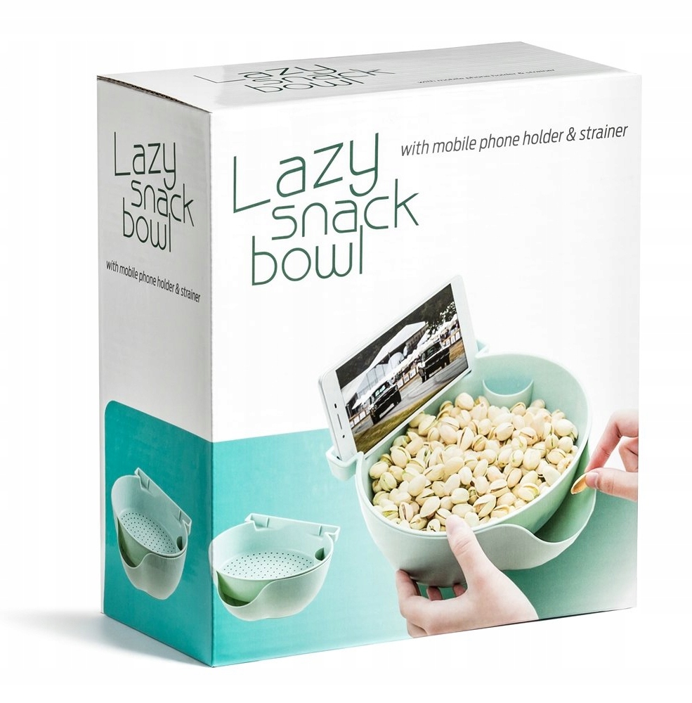 Может ли миска быть умной? Оказывается, можно :) Супер практичное оборудование для всех, кто любит перекусить во время просмотра фильмов, прослушивания музыки или веселья. Наша миска умная, потому что состоит из двух независимых частей. В верхний лоток с ситечком вы можете поместить различные закуски, такие как арахис, фисташки, семечки, а также полезные, свежевымытые, такие как помидоры черри, виноград, клубнику с плодоножками, вишню, вареную фасоль и все, что вам нравится. , и они мирно стечет на нижнюю подставку, на которой также есть место для семян, стеблей, скорлупы и т. д. Чаша еще и умна, потому что вы можете поместить смартфон в специальный карман и с комфортом смотреть любимые программы, сериалы или слушайте музыку.