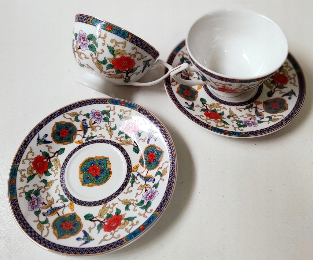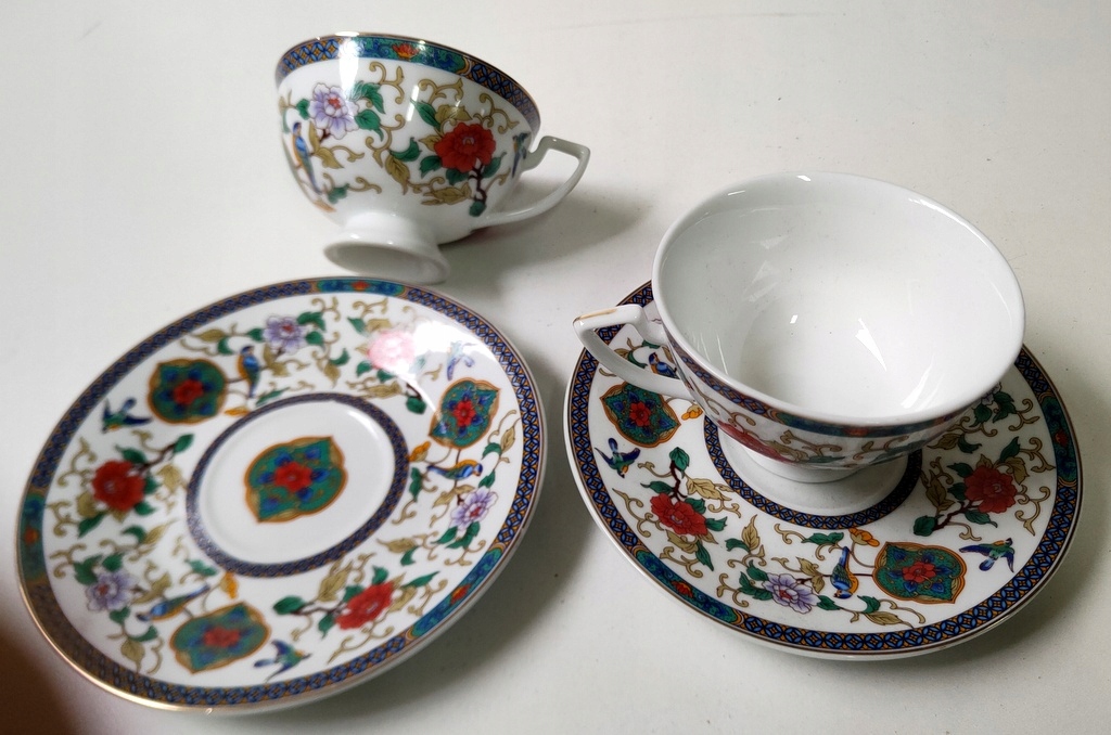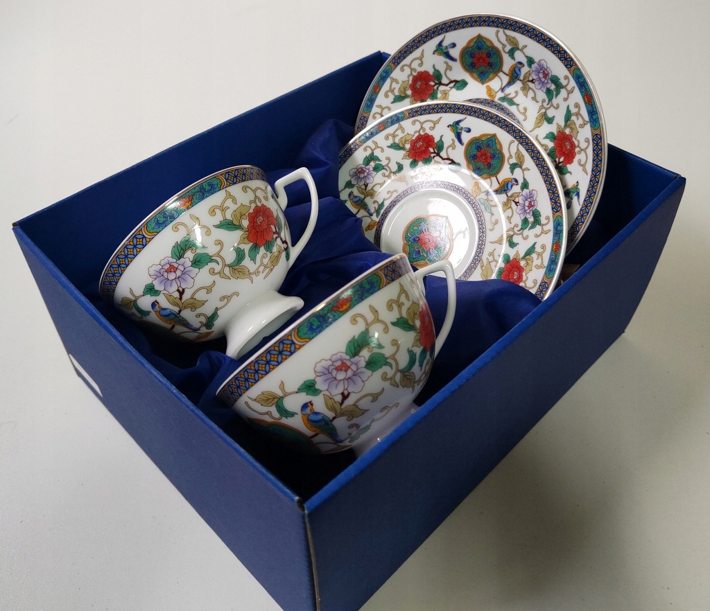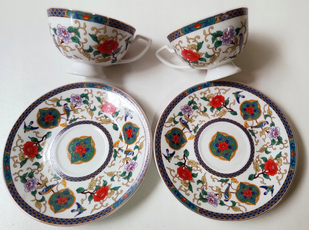 Набор из двух чашек и блюдец, выполненный в современном, старинном стиле. Состояние фарфора очень хорошее; без повреждений. Комплект впечатляет очаровательными узорами и изысканной формой.
