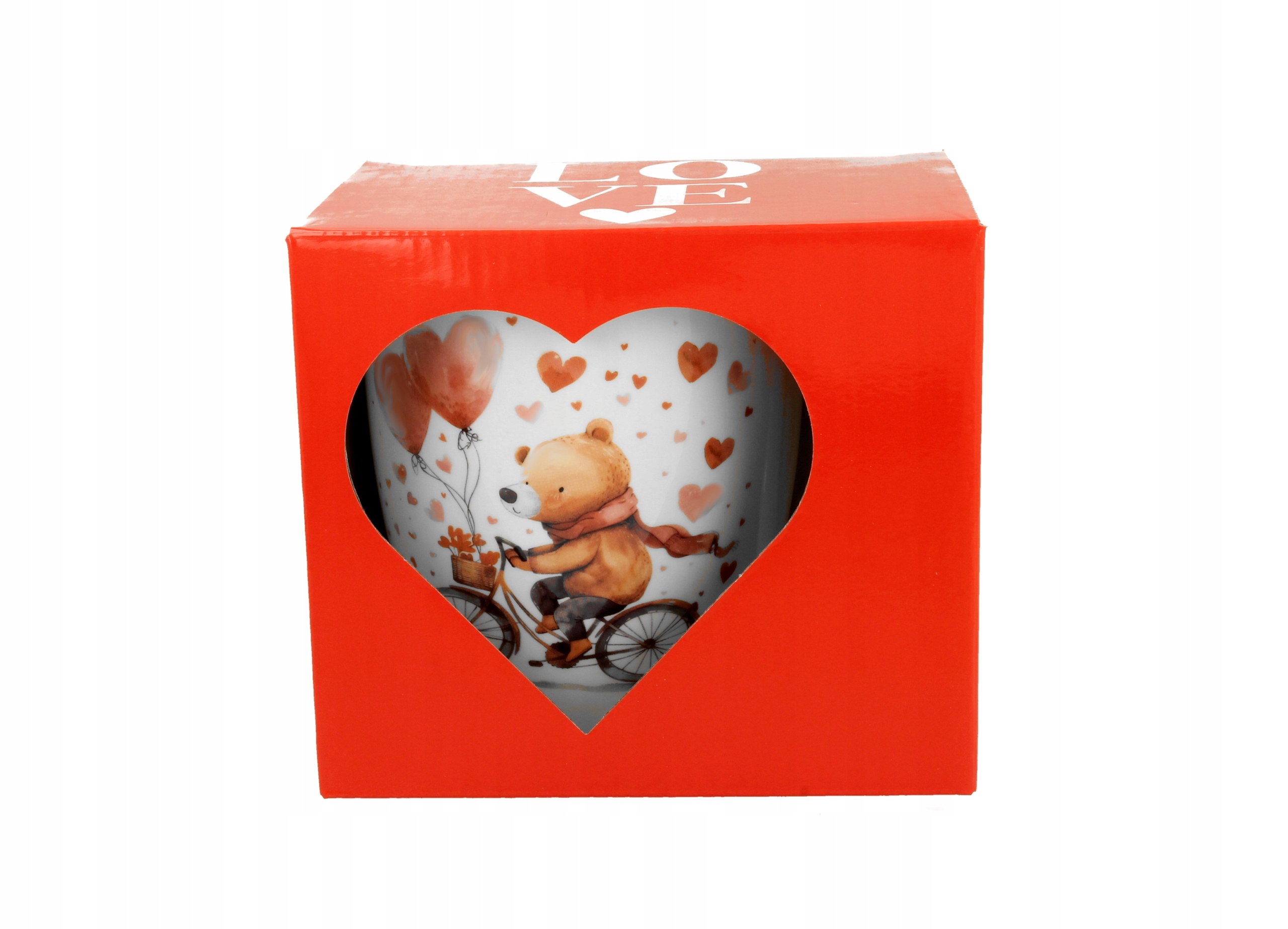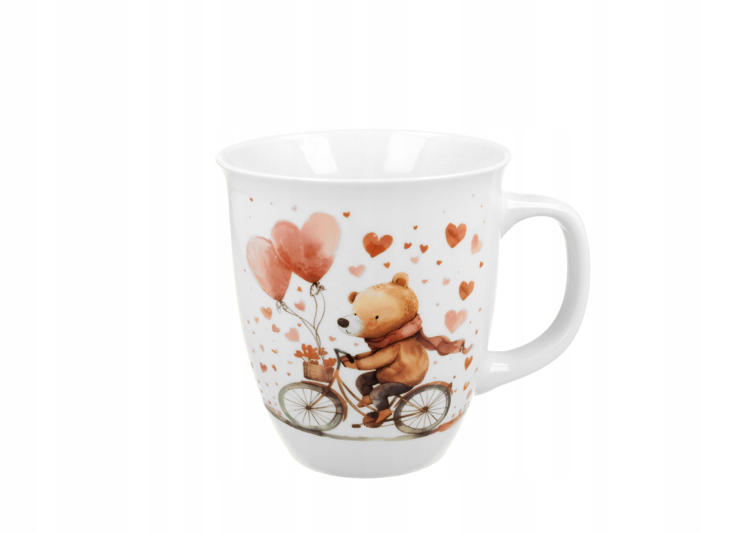 Линия, украшенная мотивом медведя, катаясь на велосипеде и окруженной разбросанными сердцами. Сочетание розового и красного с фарфором белого цвета создает гармоничную композицию