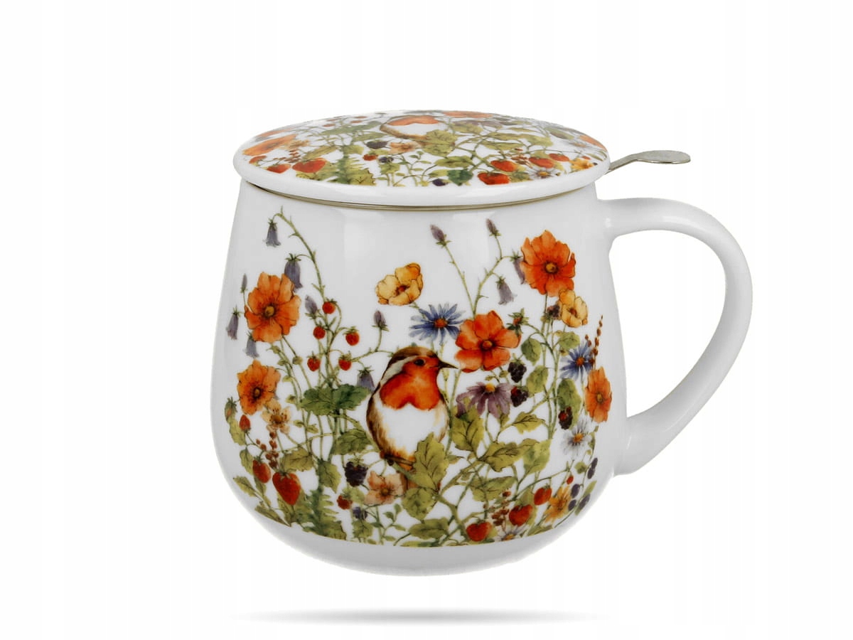 Фарфоровая чашка с емкостью 430 мл duo в сете с фарфоровой крышкой и пивоваром, украшенным мотивом дикой птицы на фоне полевых цветов. Сделано из постоянного и легкого фарфора нового костяного фарфора. Упакованный в декоративную коробку, это может быть интересным подарком для особого человека.