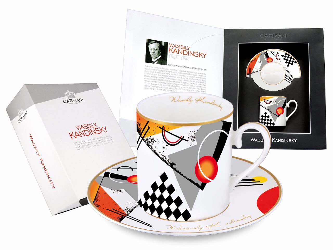 Фарфоровое из фарфора высочайшего качества, So -Salled Кость - идеальный белый, высокая прочность и низкий вес. Продукт украшен мотивом из изображения Вассли Кандинского "Orange". Чашка в подарочной коробке. Набор из коллекции Кармани. Сертификаты: WZW/GP/AT9000