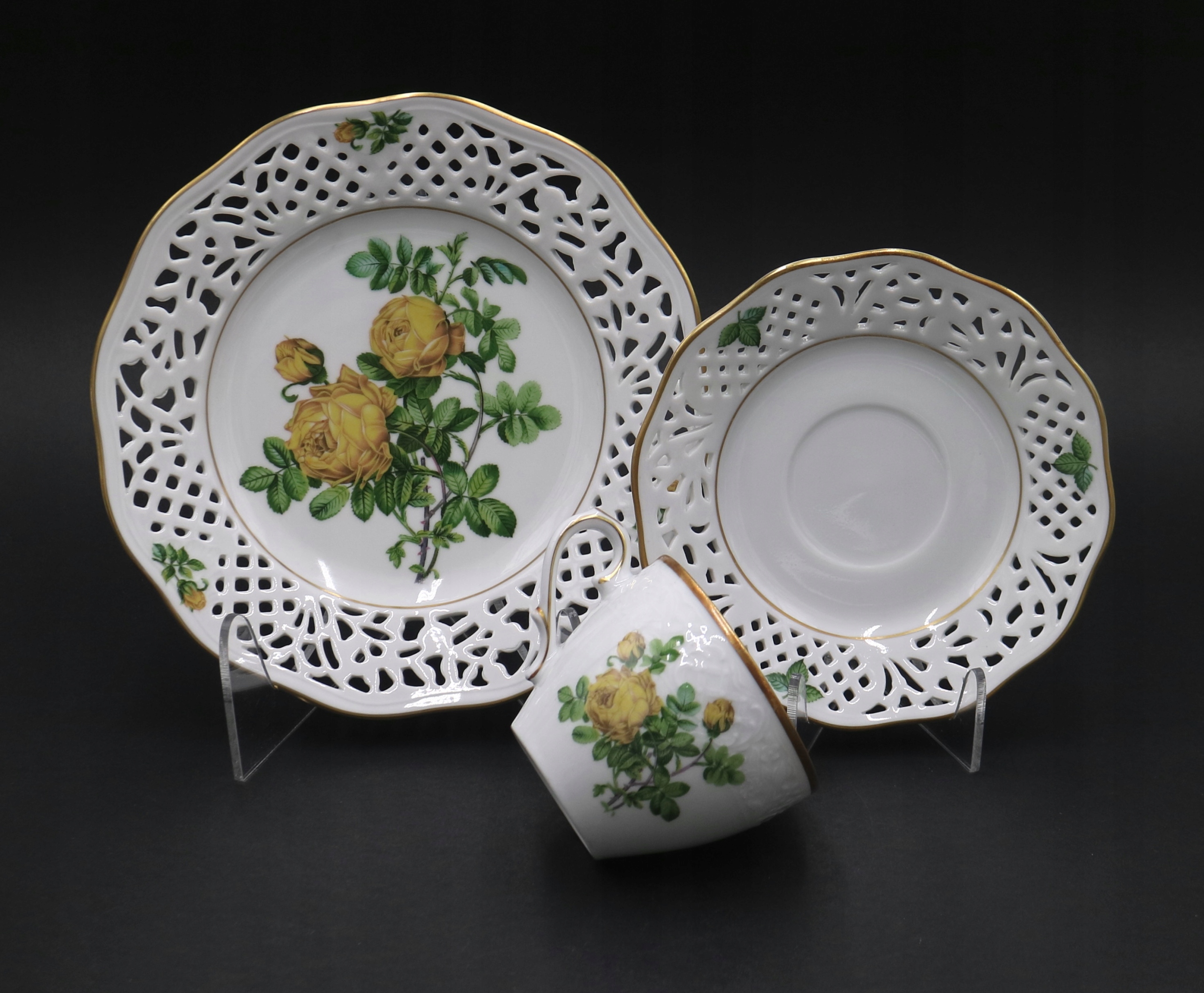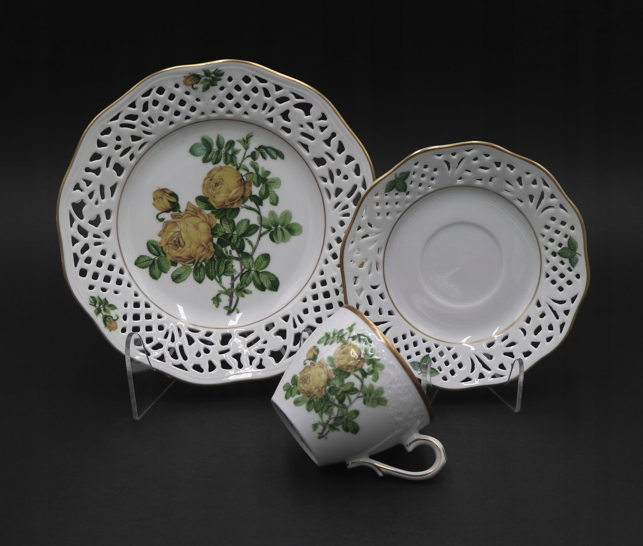 Белый фарфор, очаровательно украшенный мотивом розы. Все выглядит великолепно.