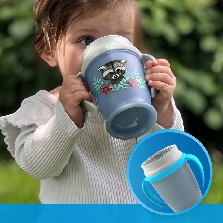 Легко мыть, позволяет пить, не проливая, но намеренно не является непроливаемым (капли жидкости выпадают при сильном встряхивании или падении). Оно учит ребенка контролировать движения и готовит его пить из открытой чашки.