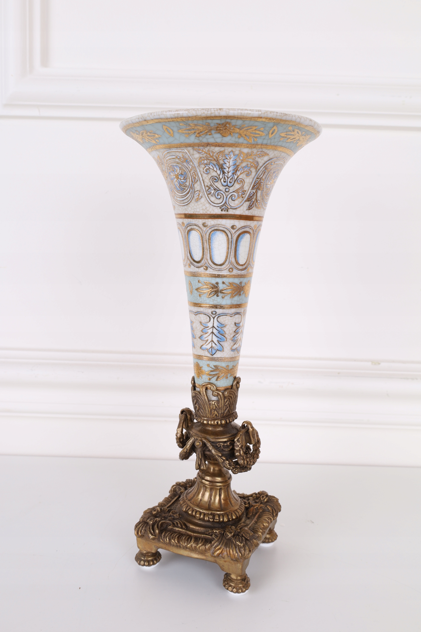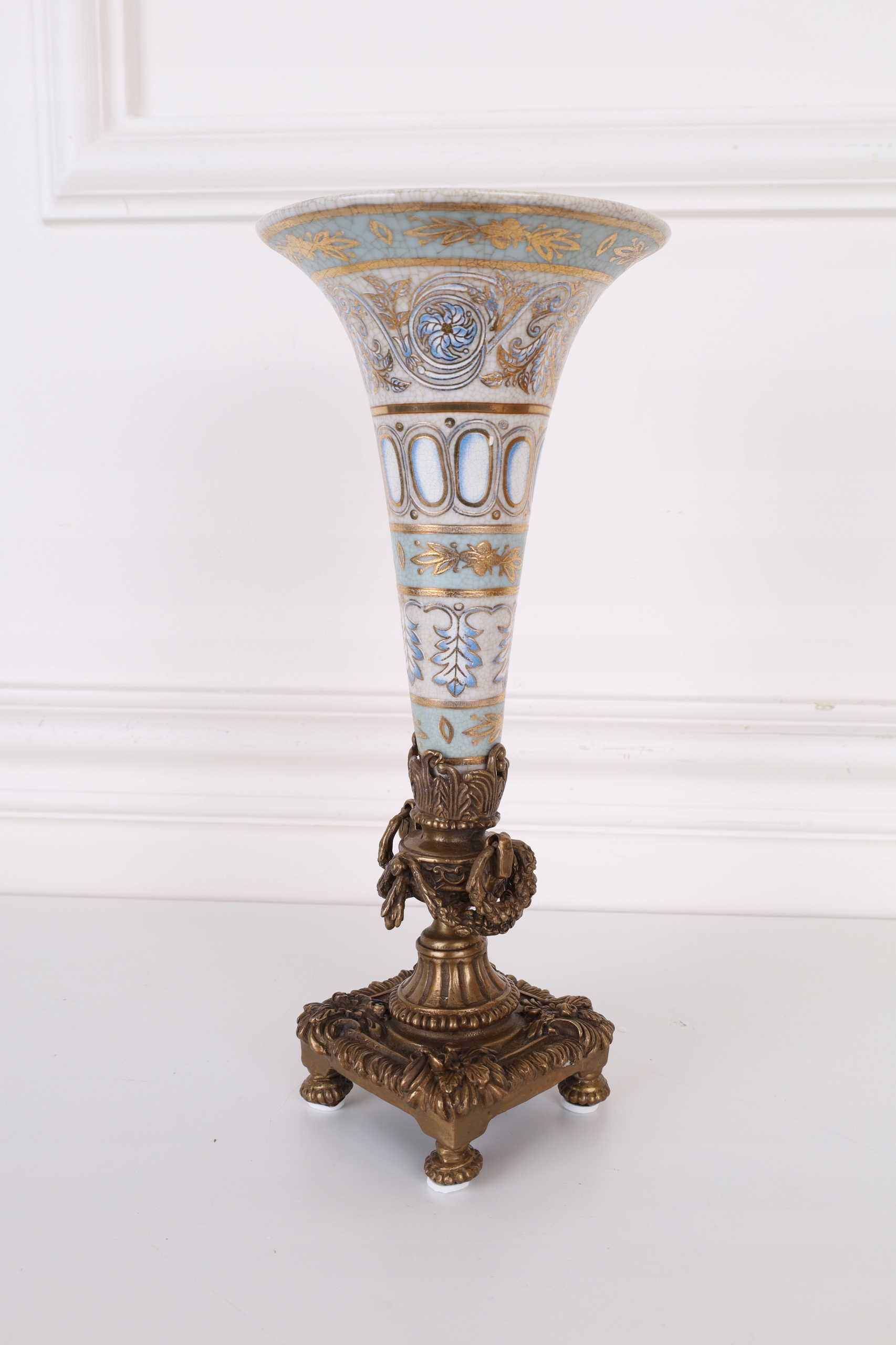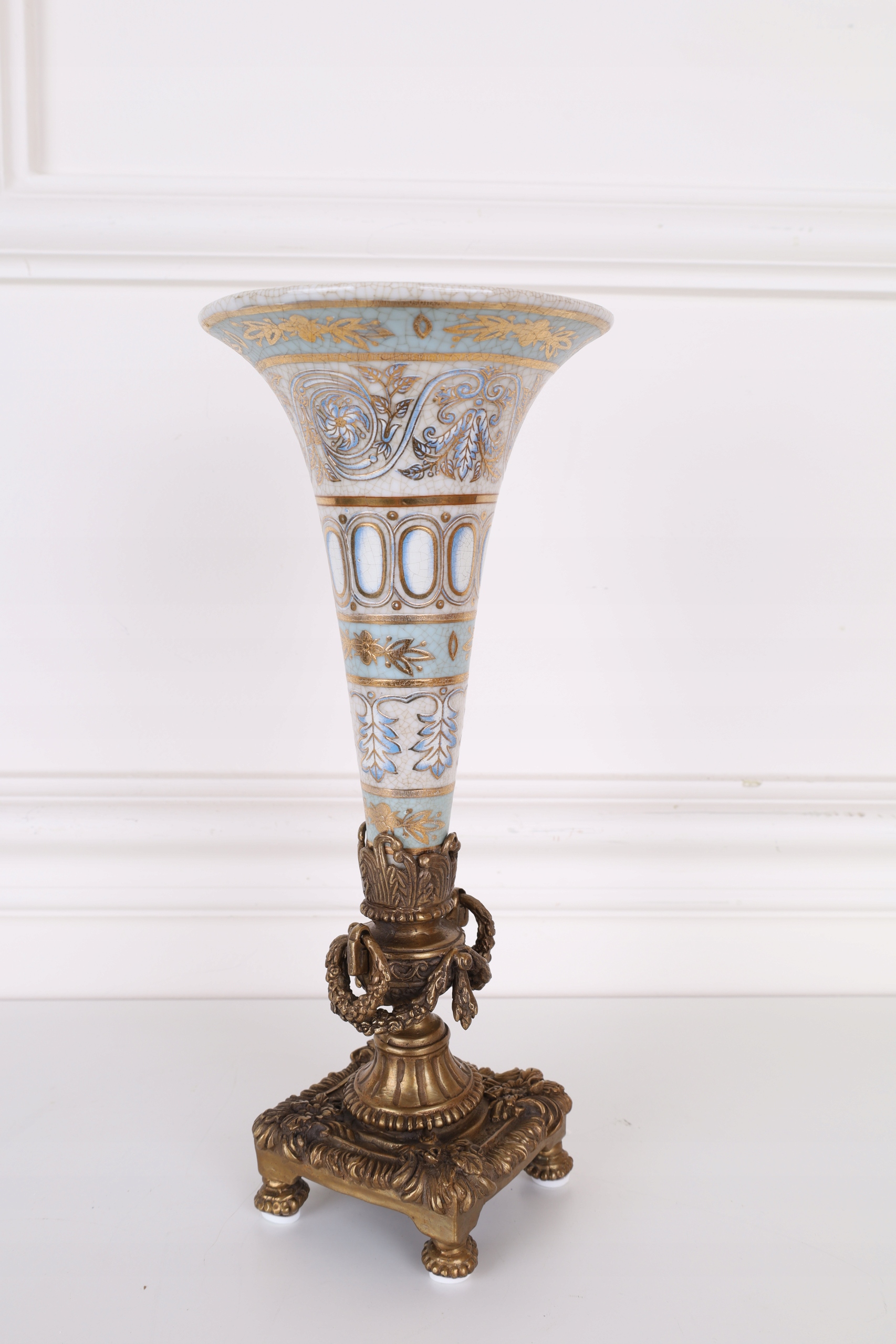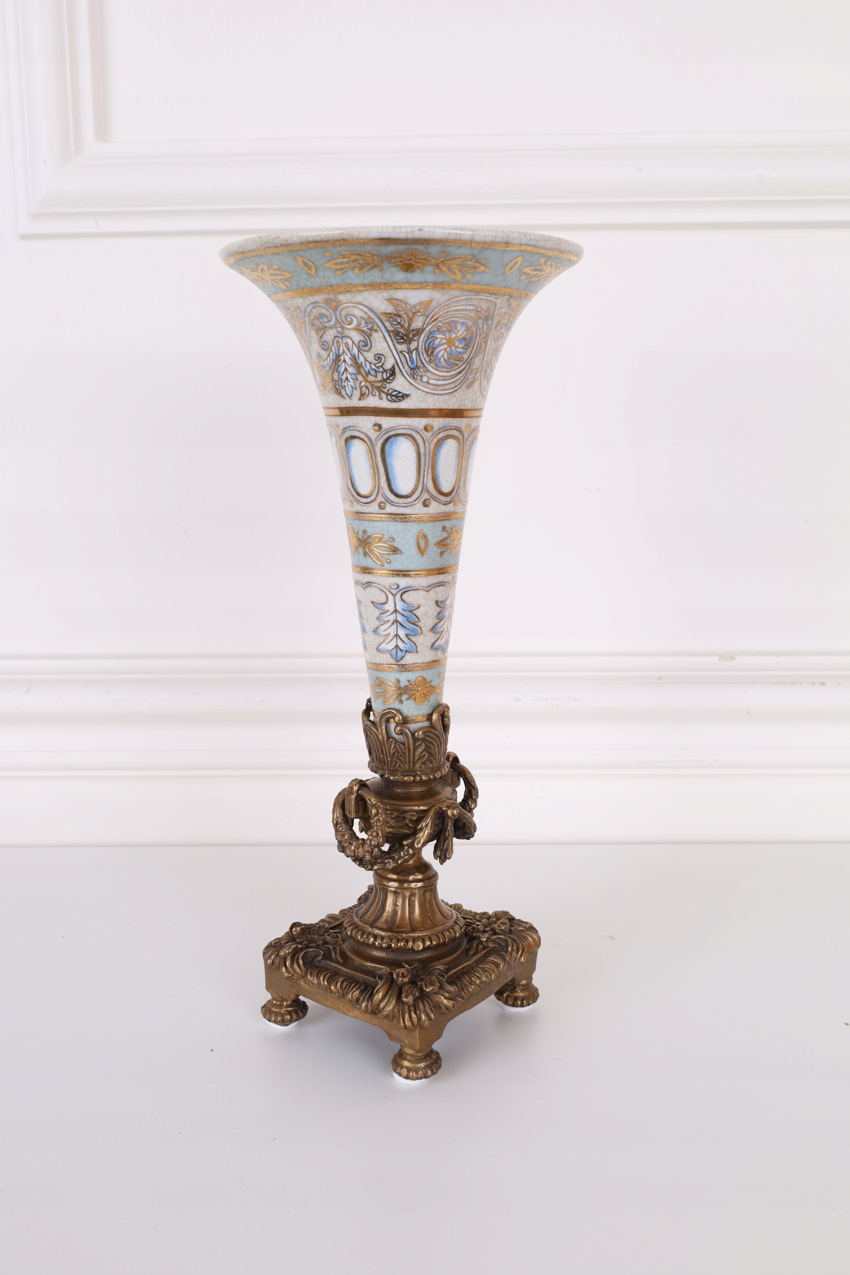 Синяя стеклянная бутылка, фарфор с бронзой.