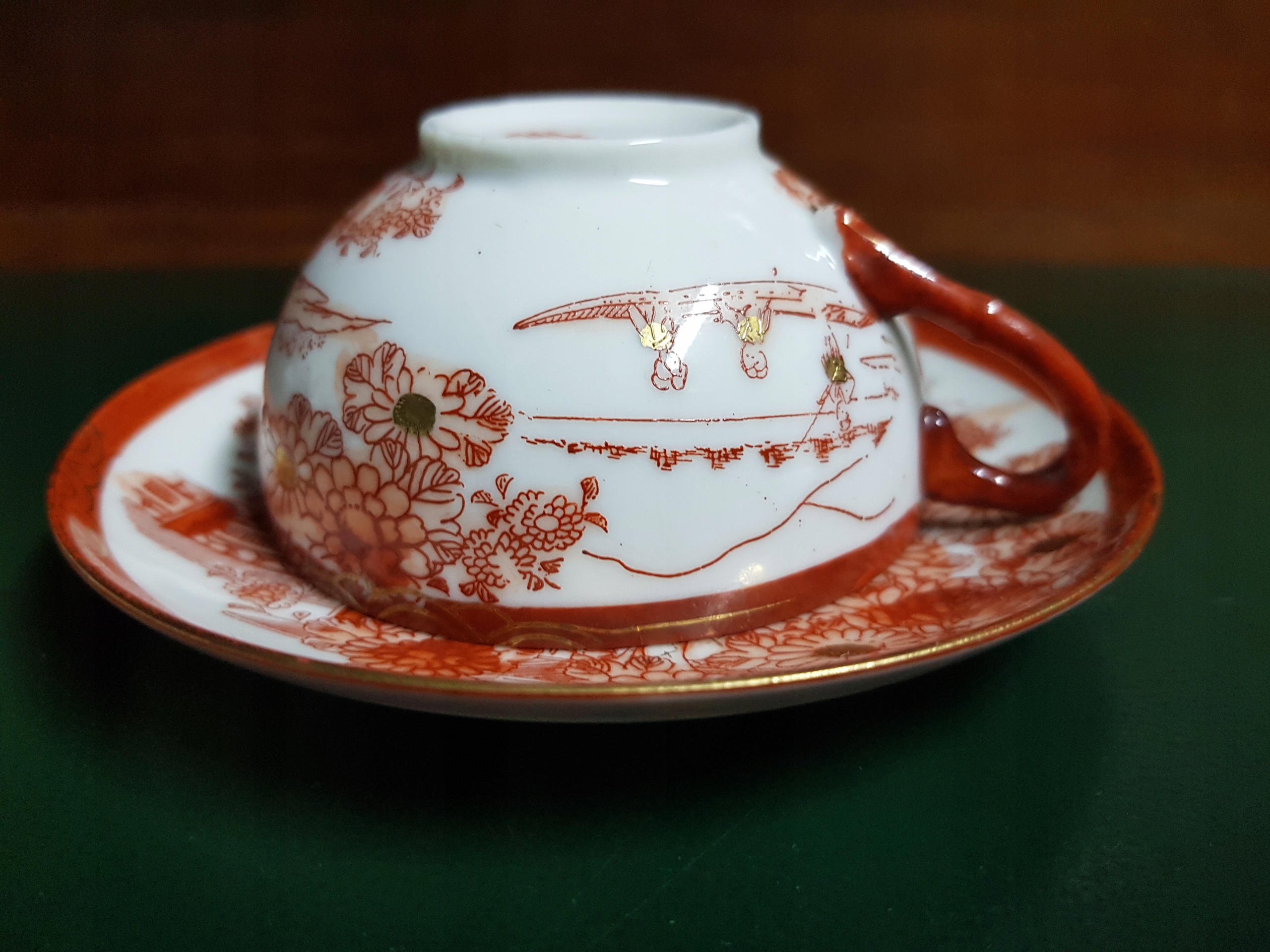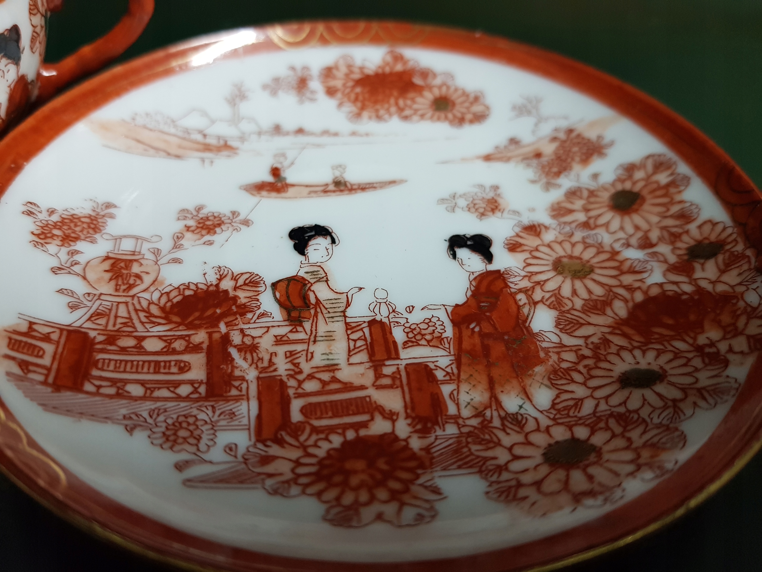 Предмет аукциона — чашка и блюдце с нарисованными вручную сценами гейш. Подписано.