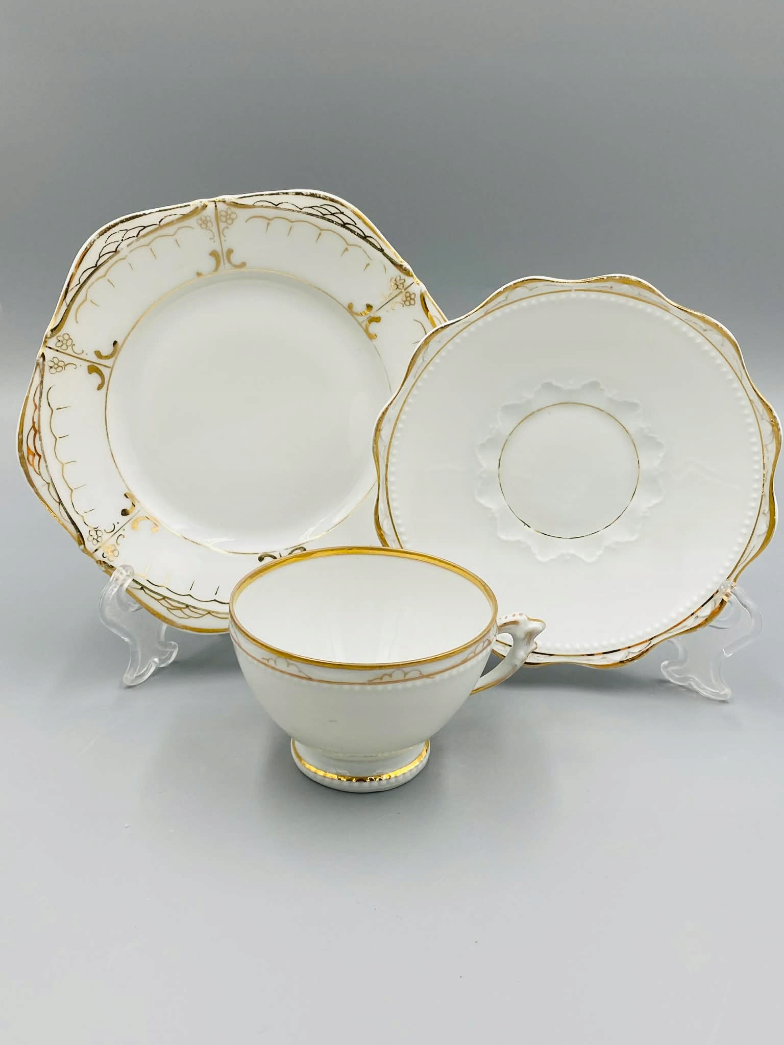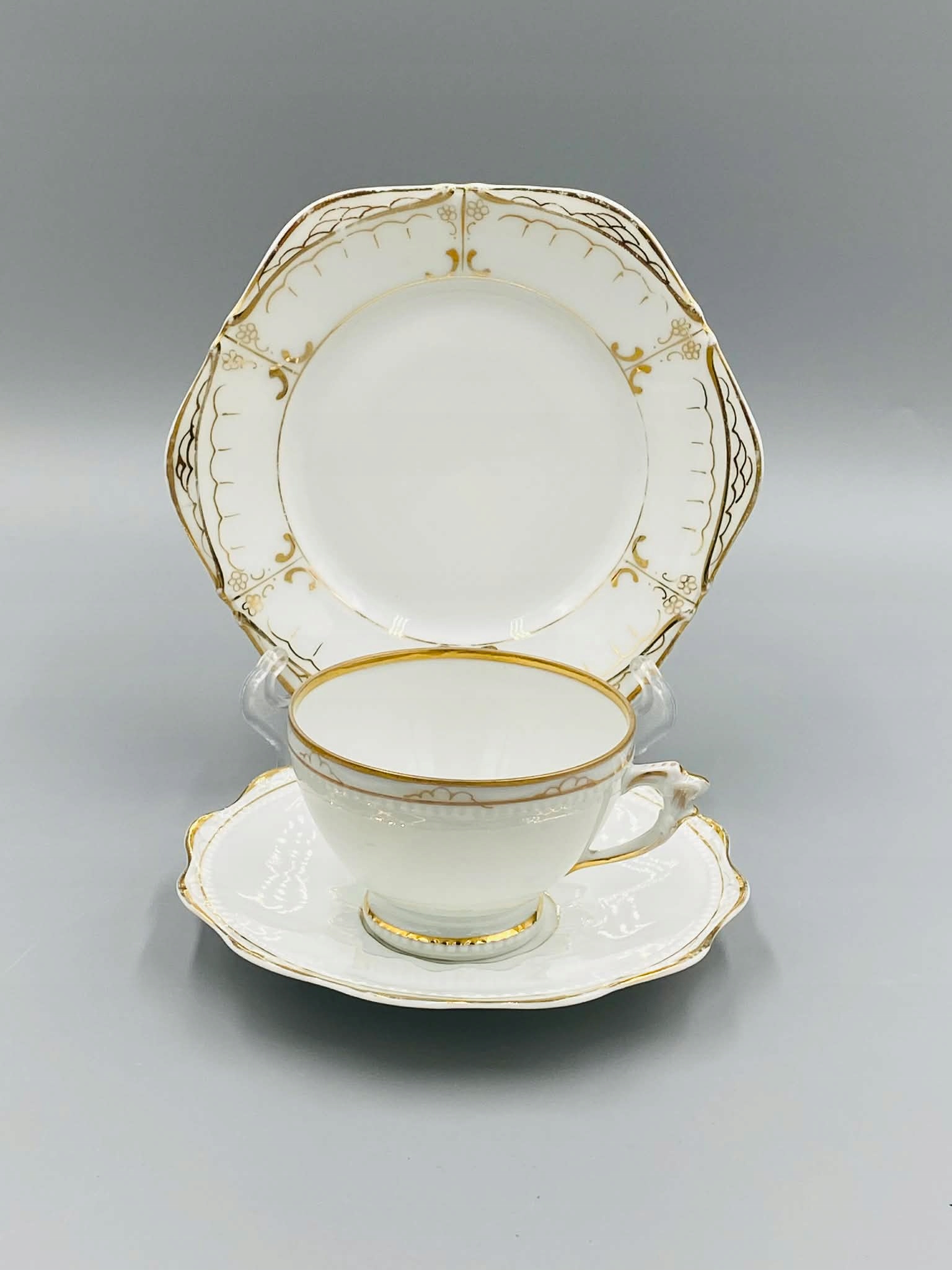Высококачественный белый, нежный фарфор, вручную украшенный позолотой. Тиснение. Края и ручка позолочены вручную.