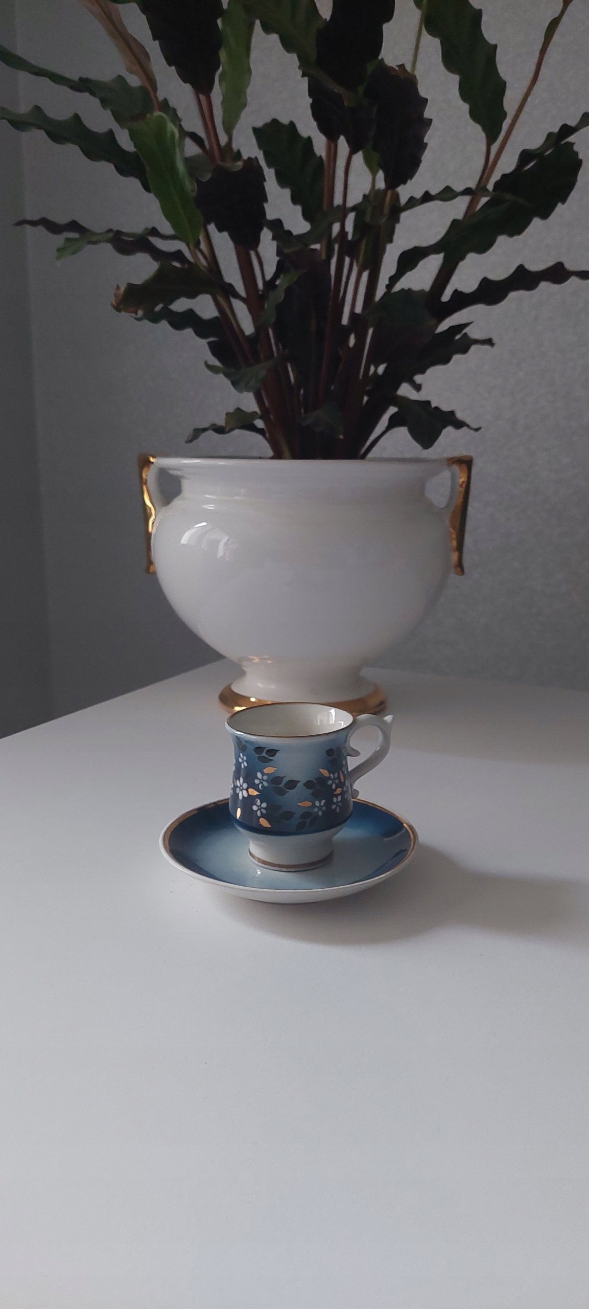 Чашка мокко с размерами: высота чашки 6 см, диаметр наполнителя 5 см, диаметр тарелки чашки 10 см.