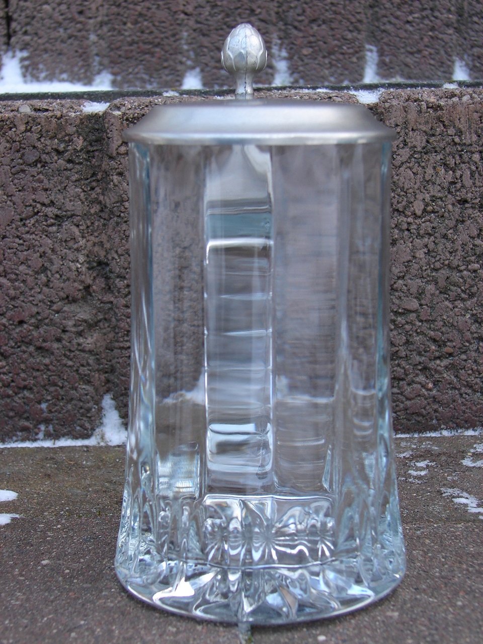 Массивная стеклянная кружка с жестяной крышкой.