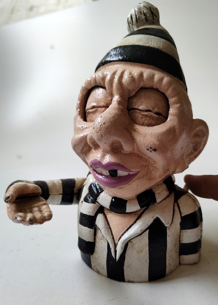 Piggybook h1> сделан из чугуна, изображающий заключенного в полосатом, как поросший берег. После нажатия на рычаг, Господь поднимает руку, на которую расположена монета, и он бросает в глаза, что автоматически открывается. h1> Я настоятельно рекомендую h1>