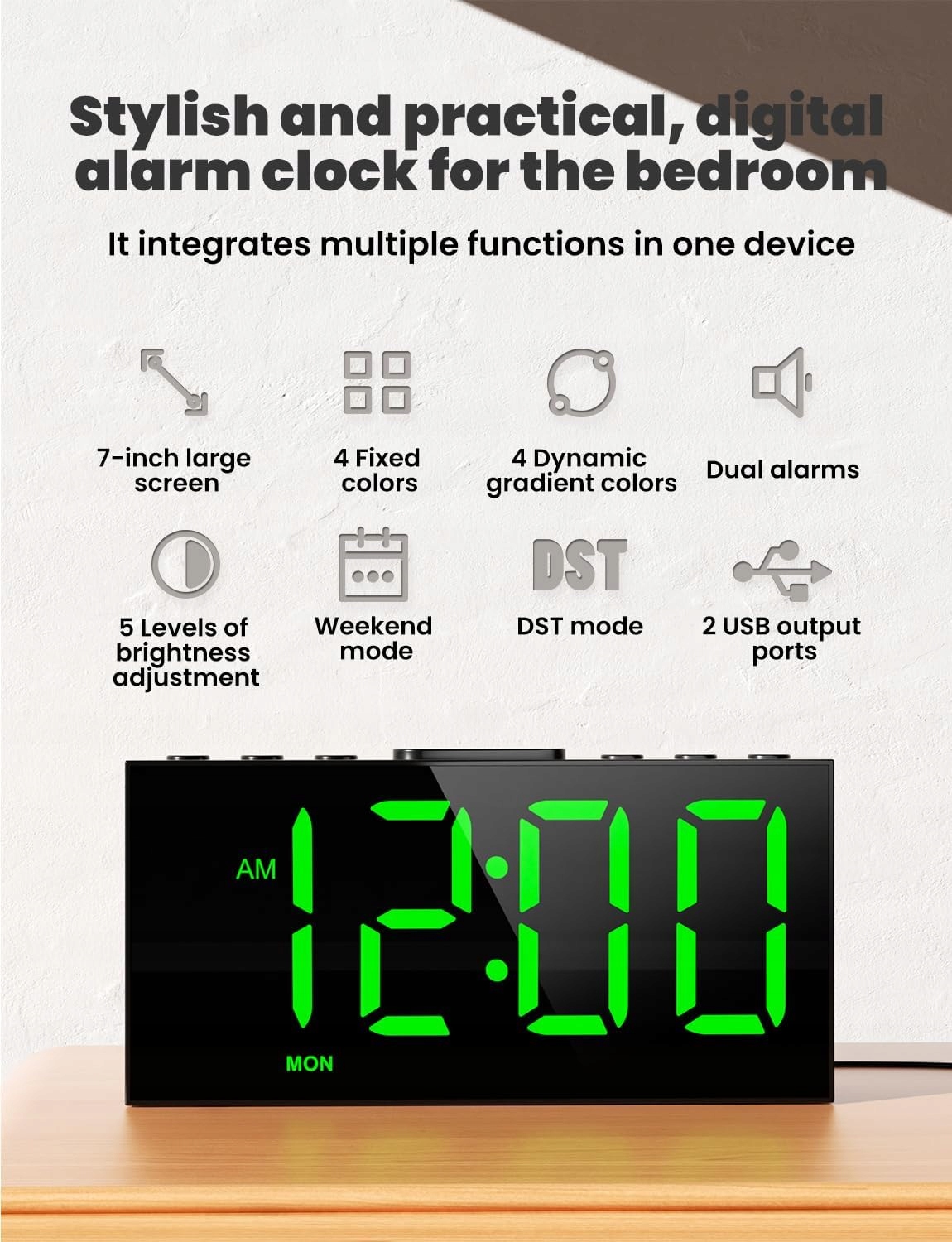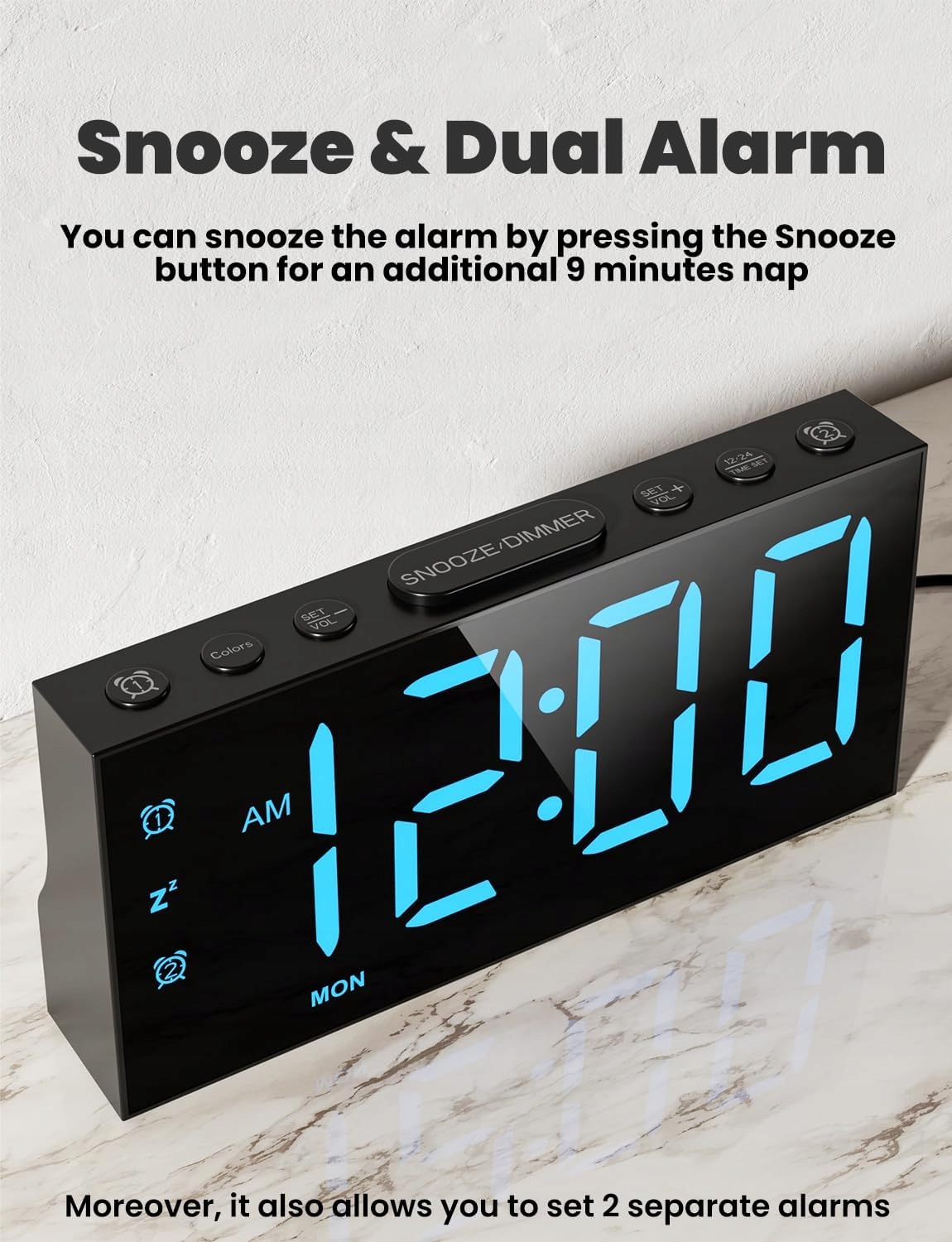 rgb-динамические цвета -Этот светодиодный будильник имеет 4-цветный дисплей (белый, красный, зеленый, синий). В дополнение к стандартным цветам, цифровые будильники также предлагают динамический режим изменения цвета RGB, который придаст вам немного радости в вашу комнату.