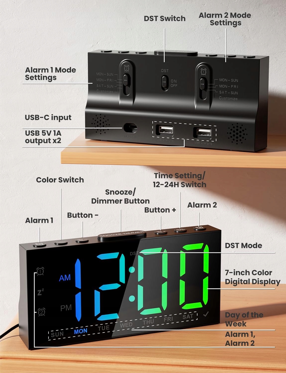 двойной USB -зарядной порты - Эта ночная тревога может заряжать 2 устройства одновременно, используя два выхода USB 5 В 1 A при спите.