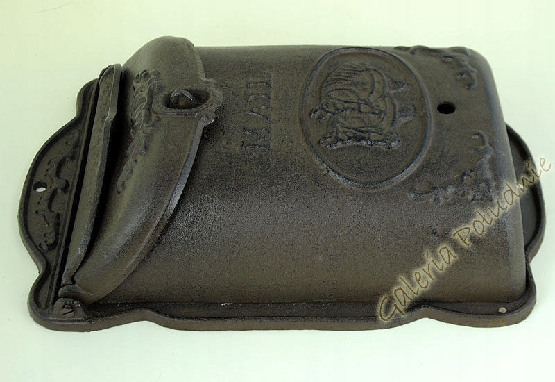 Чугунный почтовый ящик, украшенный двумя лошадиными головами.Ящик имеет большое отверстие для вынимания почты, меньшее для ее сдачи и глазок для обозначения наличия почты.