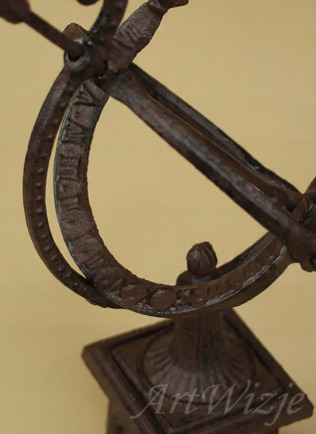 Солнечные часы из чугуна и бронзы с индикатором, показывающим время, написанным на внешнем циферблате.
