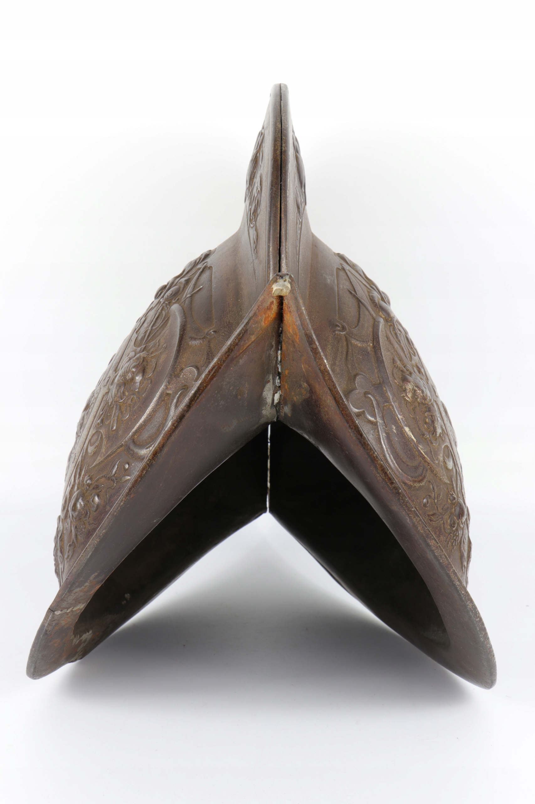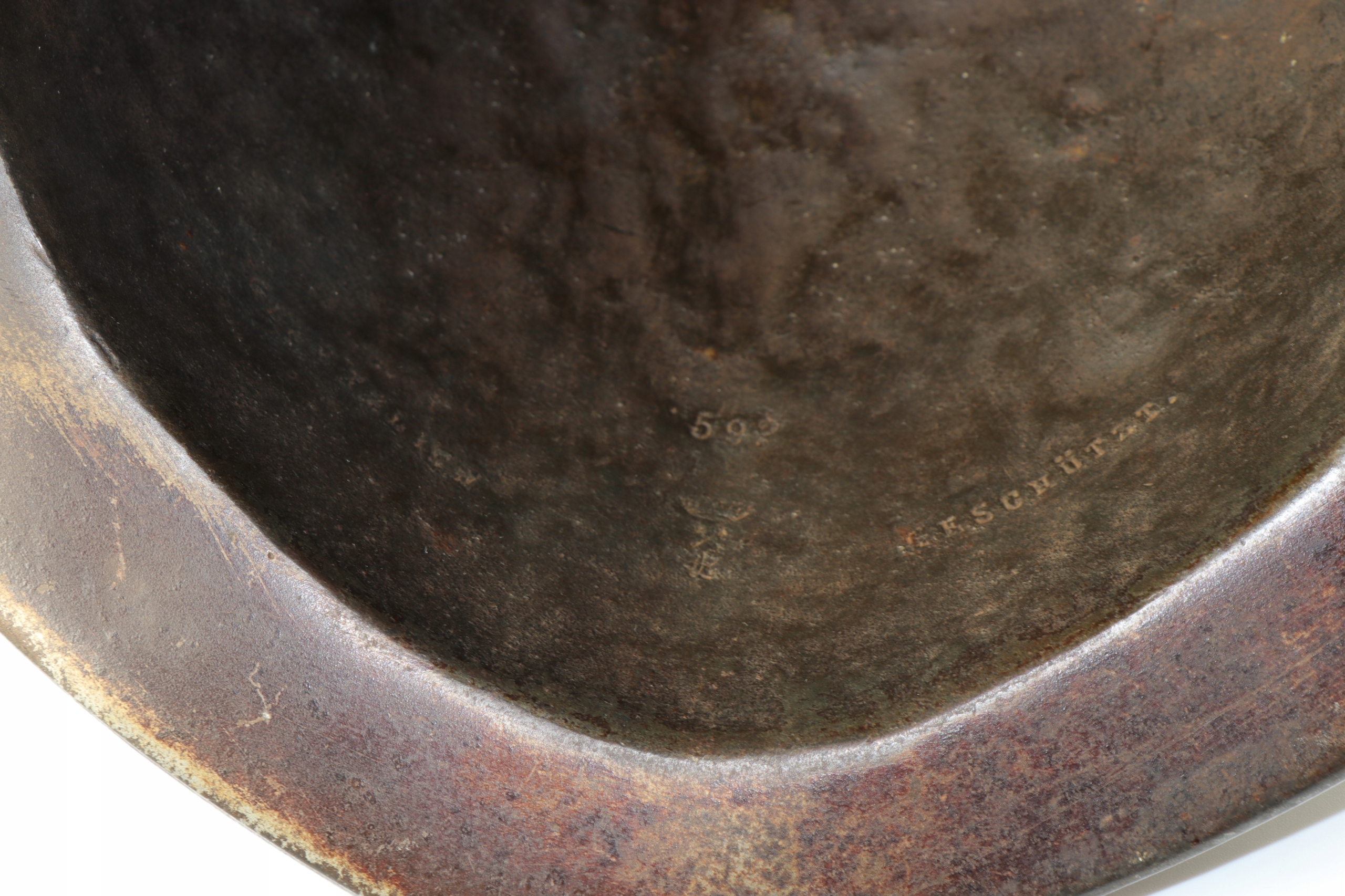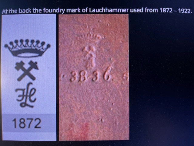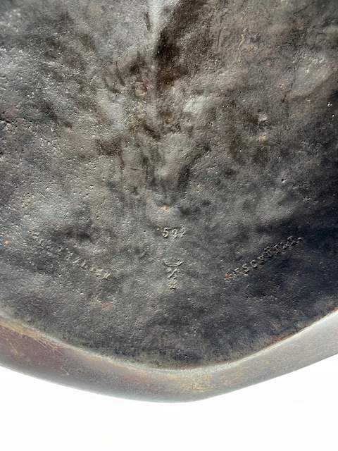 Интересная, очень редкая чугунная копия шлема типа Марион. Отливка была произведена в немецком литейном заводе Eisenwerk Lauchhammer, отмечена литейной короной, каталожным номером и надписью Gesetzlich Geschützt. Шлем, должно быть, был украшением какого-то дворца или замка.