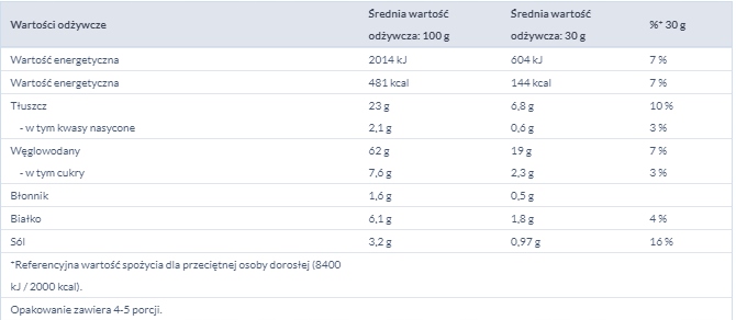 Состав: Крупа кукурузная 66%, масло рапсовое растительное, сухая молочная сыворотка, соль, глюкоза, усилители вкуса (глутамат натрия, гуанилат натрия, инозинат натрия), ароматизаторы (содержит молоко, сою), краситель (экстракт паприки)< /п>