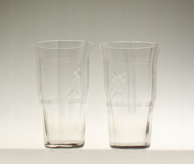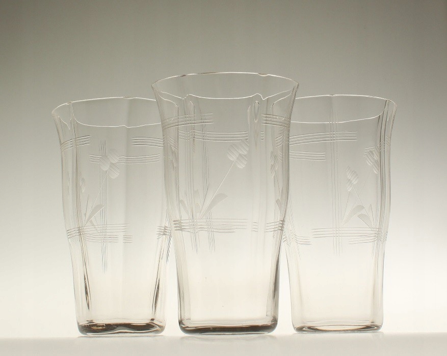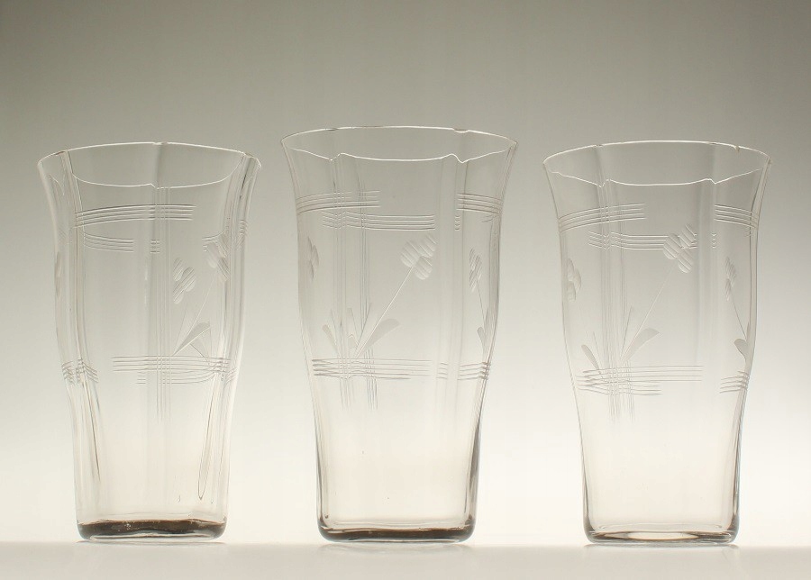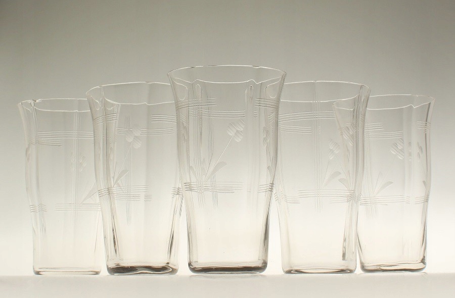 Шесть узких бесцветных бокалов. Чаши состоят из шести слегка выпуклых клиньев, украшенных ажурным вырезом, состоящим из полосок и растительных деталей. Очки родом из Чехословакии. Примерно первая половина 20 века.