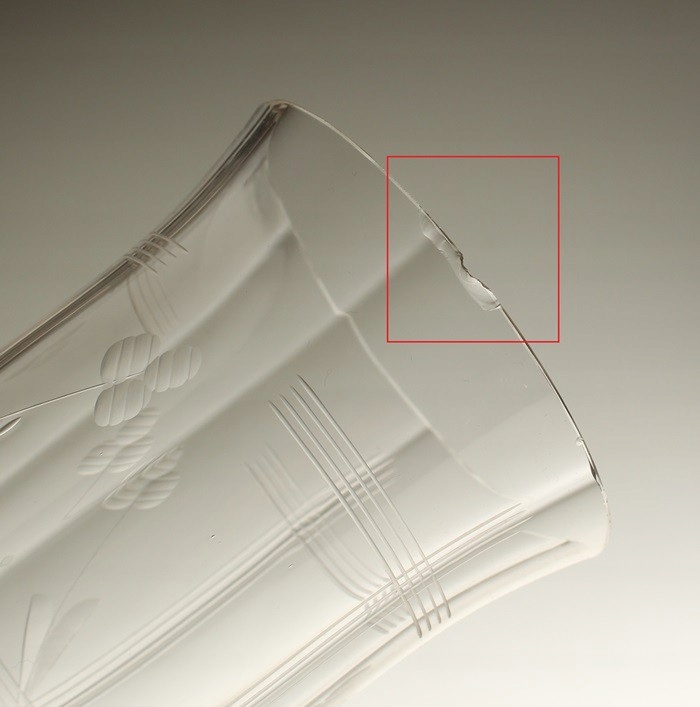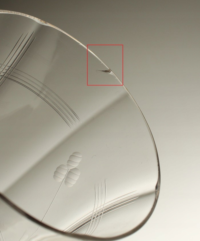 Внутри чашек нет трещин и осадка. Единичные функциональные царапины на внешней стороне чашек. Имеются дефекты по краям чашек двух стаканов: от ок. 1 мм до ок. 1,3 см. По краю верхней трети стекла диагональная трещина, ок. Края оснований целые.