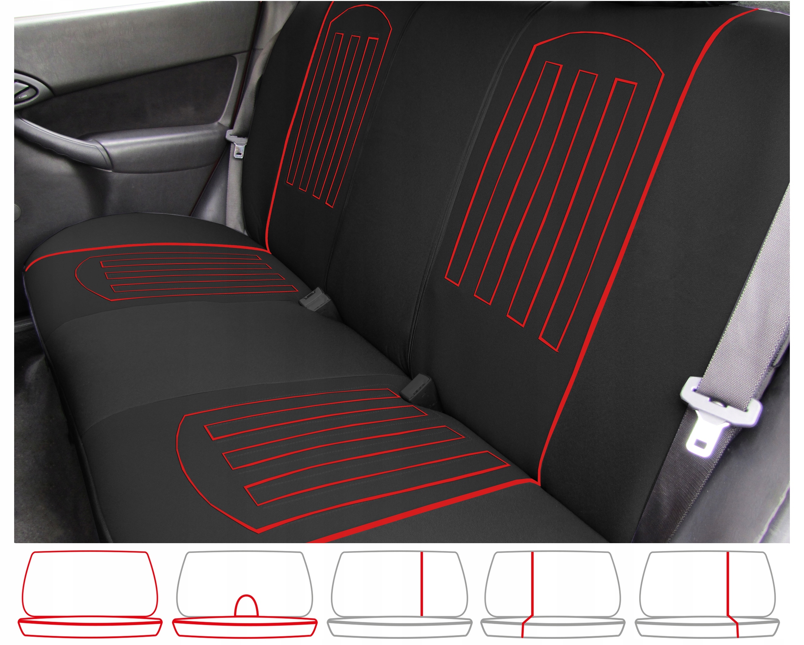 Чехлы на спинку и сиденье заднего сиденья имеют систему застежек-молний, поэтому чехлы можно использовать для автомобилей как с цельными, так и с разделенными сиденьями в вышеуказанных вариантах.