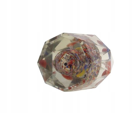 Коническое пресс-папье. Его поверхность украшена тщательно отполированными многоугольниками. Внутри стеклянной массы на разноцветном постаменте встроены разноцветные цветы. Пуговица родом из Чехословакии. 2-я половина XX век