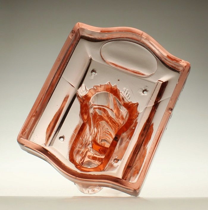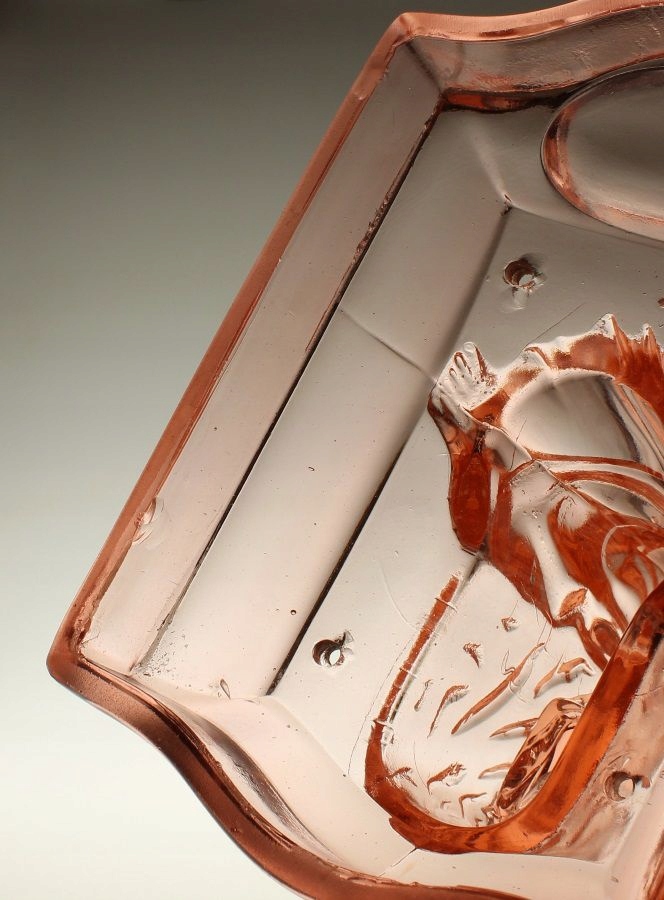 Фигульный подсвечник с мотивом Иисуса Христа с горящим сердцем. Изготовлен из розового содового стекла в технике прессования. Подсвечник родом из Чехословакии - вероятно, с фабрики Йозефа Риделя. Довоенный образец.