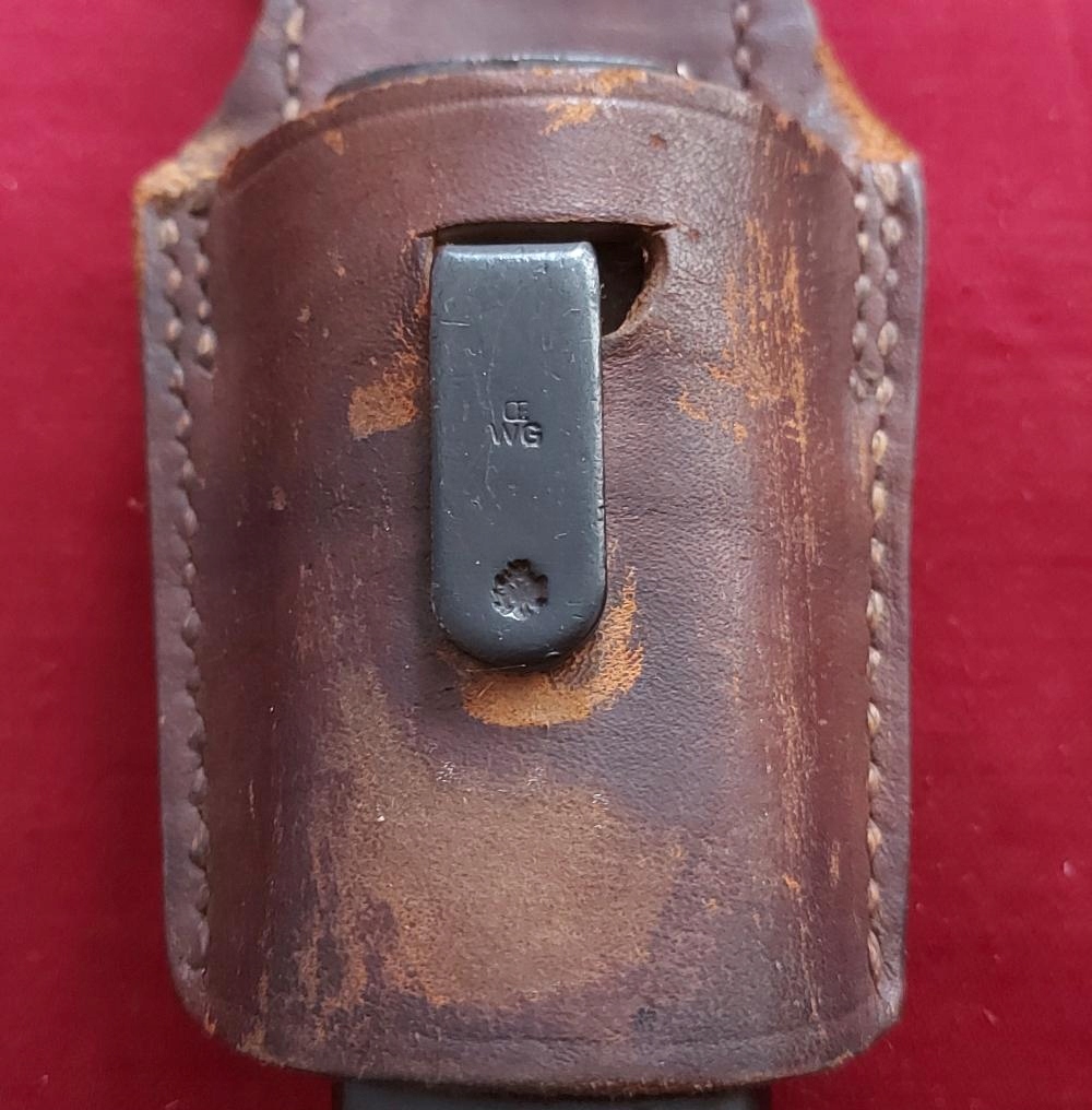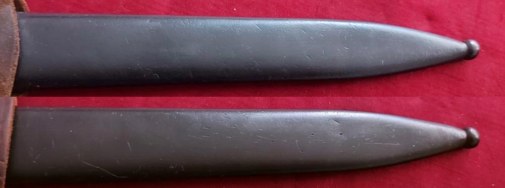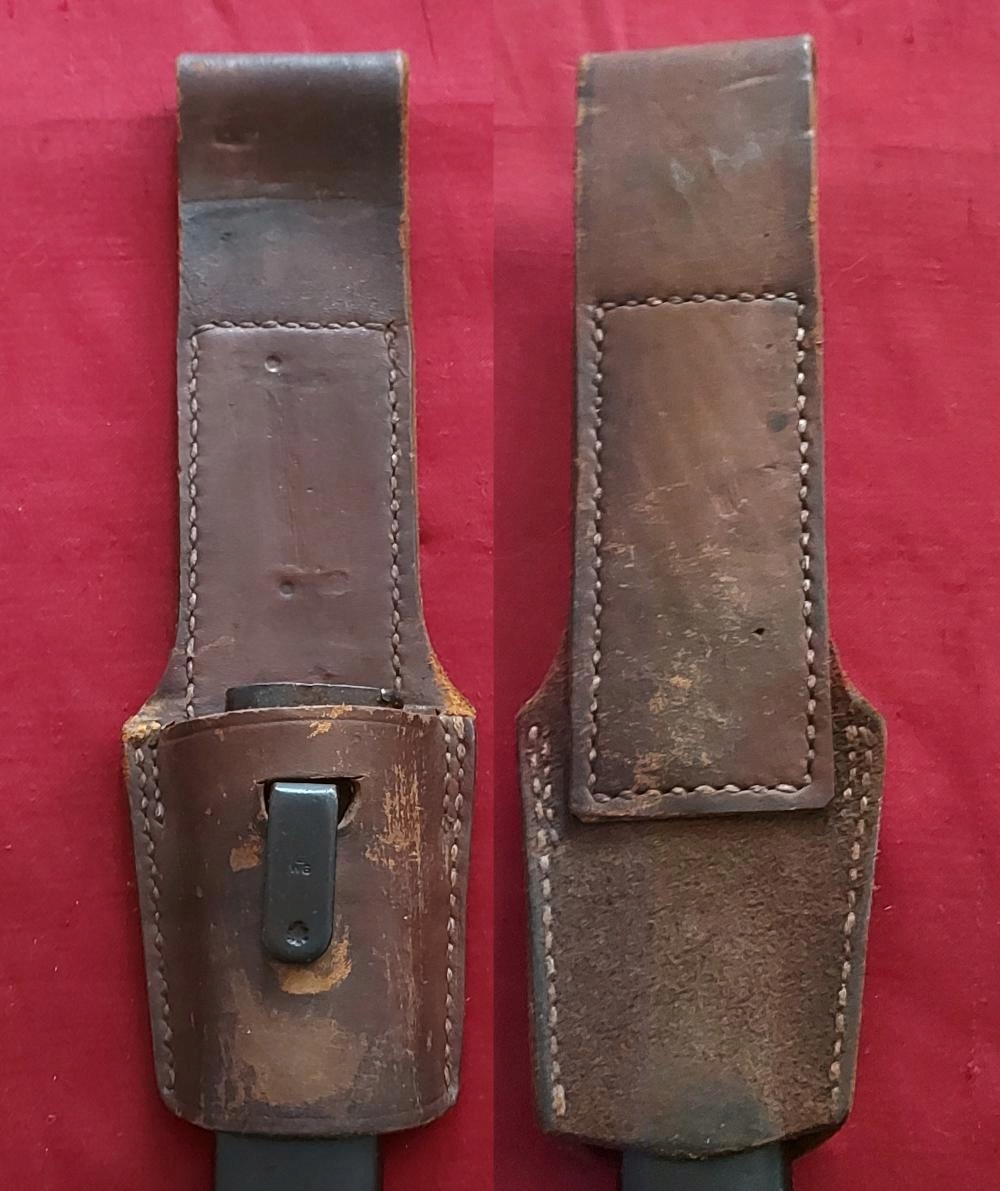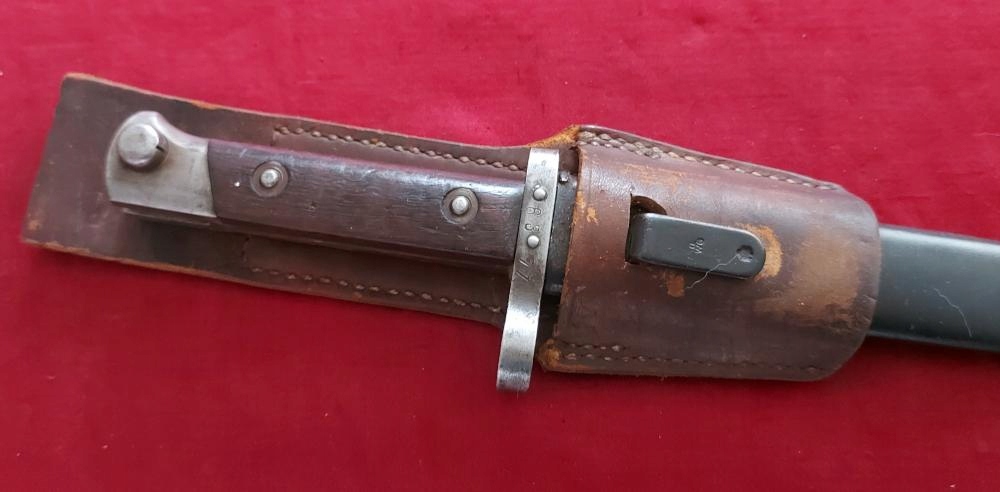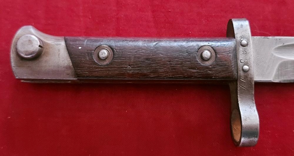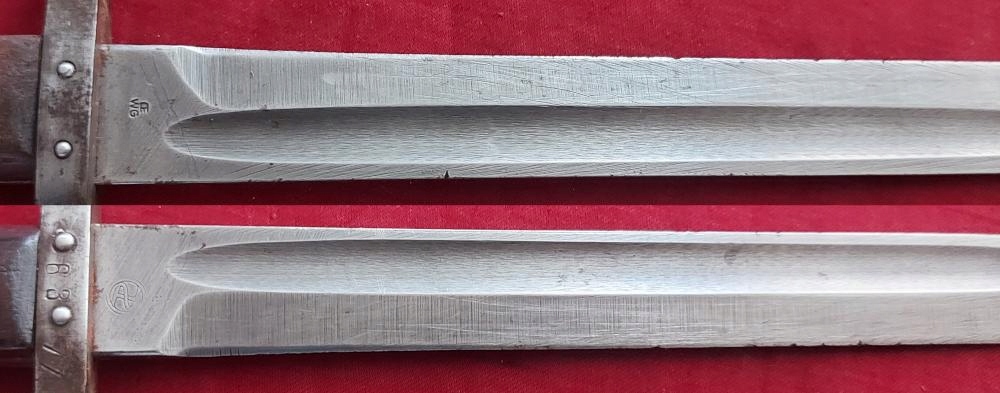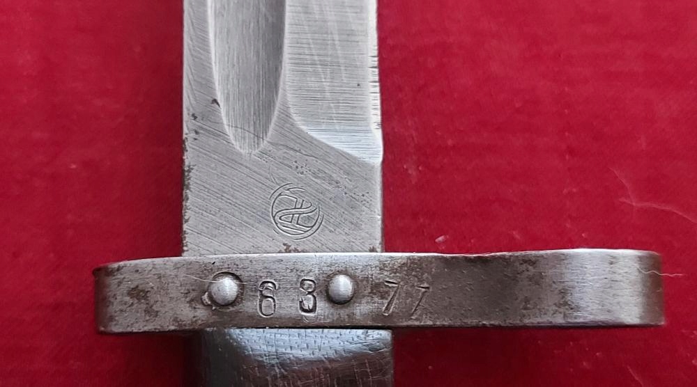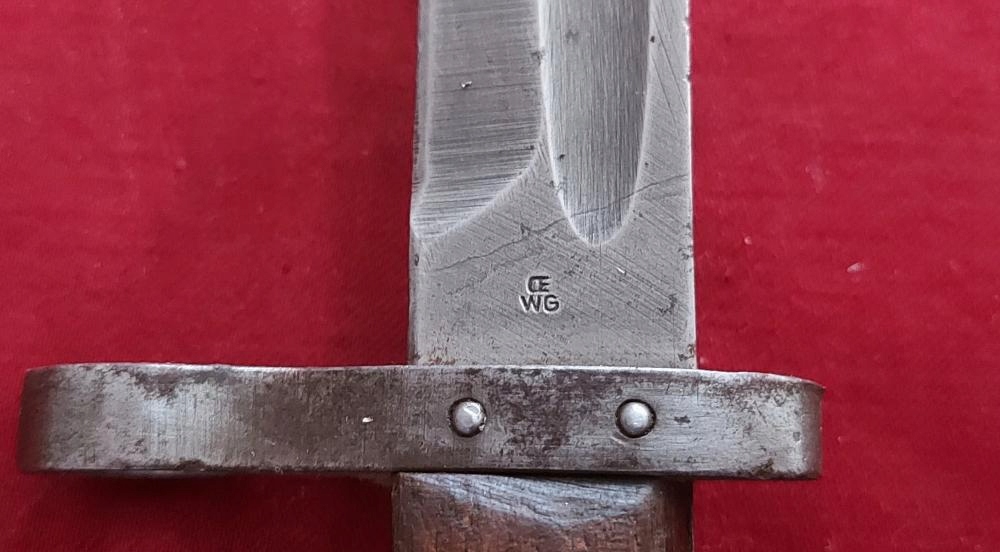 Штык, видимый на фотографиях, очень хорошо сохранившаяся копия. Лезвие не заточено, имеются незначительные следы заточки. На краю лезвия имеется клеймо производителя OEWG - клеймо завода STEYR, на другой стороне клеймо ZP - Zbrojovka Praga s.r.o. Прага - Вршовиче. На поперечине выбит номер 63 77. Накладки на ручки деревянные и оригинальные. Байонетный замок работает.