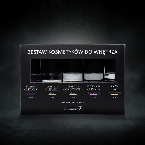 В набор входят пять профессиональных косметических средств во флаконах по 50 мл каждый, упакованных в эстетичную коробку. Идеально подходит для чистки и ухода за обивкой, кожей, пластиком и элементами салона автомобиля — идеально подходит как для собственного использования, так и в качестве тестового набора или подарка. Комплексный уход за салоном автомобиля в компактной форме.
