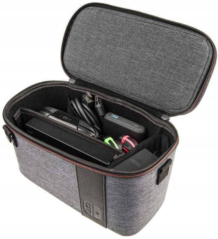Чехол Pull-N-Go подходит для консоли, док-станции, контроллеров Pro, адаптера переменного тока, кабелей HDMI, дополнительных устройств Joy-Game. Минусы, игровые карты и другие мелкие аксессуары.