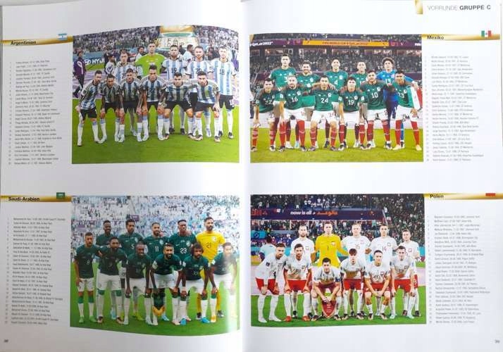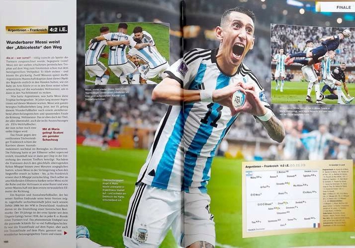 Описание: «Знаменитый футбольный журнал». Катар, этот эффективный альбом, в котором посланники «Kicker» для финалов чемпионата по футболу 2022 года представили резюме этого события. В дополнение к отчетам из каждого турнирного матча (описание, фотографии, документация), впечатляющие фотографии с поля, стенды и закулисные кубка мира, книга также включает в себя профессиональный анализ и комментарии, полные сотрудников всех команд, а также их фотографии, а также на последних страницах также наборы результатов от чемпионатов мира по мировым чемпионатам QATAR 2022 и из предыдущих финальных турниров 1930-2018. Альбом написан на немецком языке.