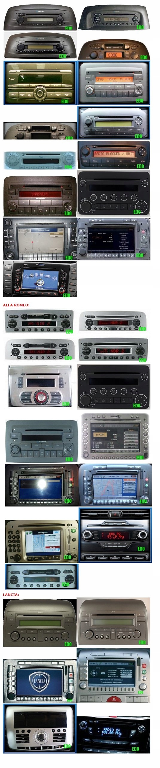 - Blaupunkt, Connect Nav+ (Magneti Marelli), Lancia 843 CD, Lancia 848 MP3 SB03, FIAT 312 MP3 SB05: Blaupunkt 376/378/379/937/939/947, Connect Nav+ (Magneti Marelli), ALFA 940 LOW PLUS< /li>