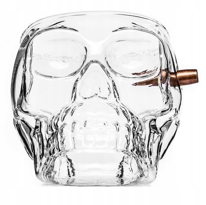 Элегантное пуленепробиваемое стекло в форме черепа. На этот раз шальная пуля застряла в стеклянном черепе, и вылить из него любимый напиток было по-настоящему необычно.