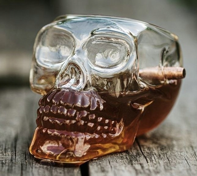 Элегантное пуленепробиваемое стекло в форме черепа. На этот раз шальная пуля застряла в стеклянном черепе, и вылить из него любимый напиток было по-настоящему необычно.