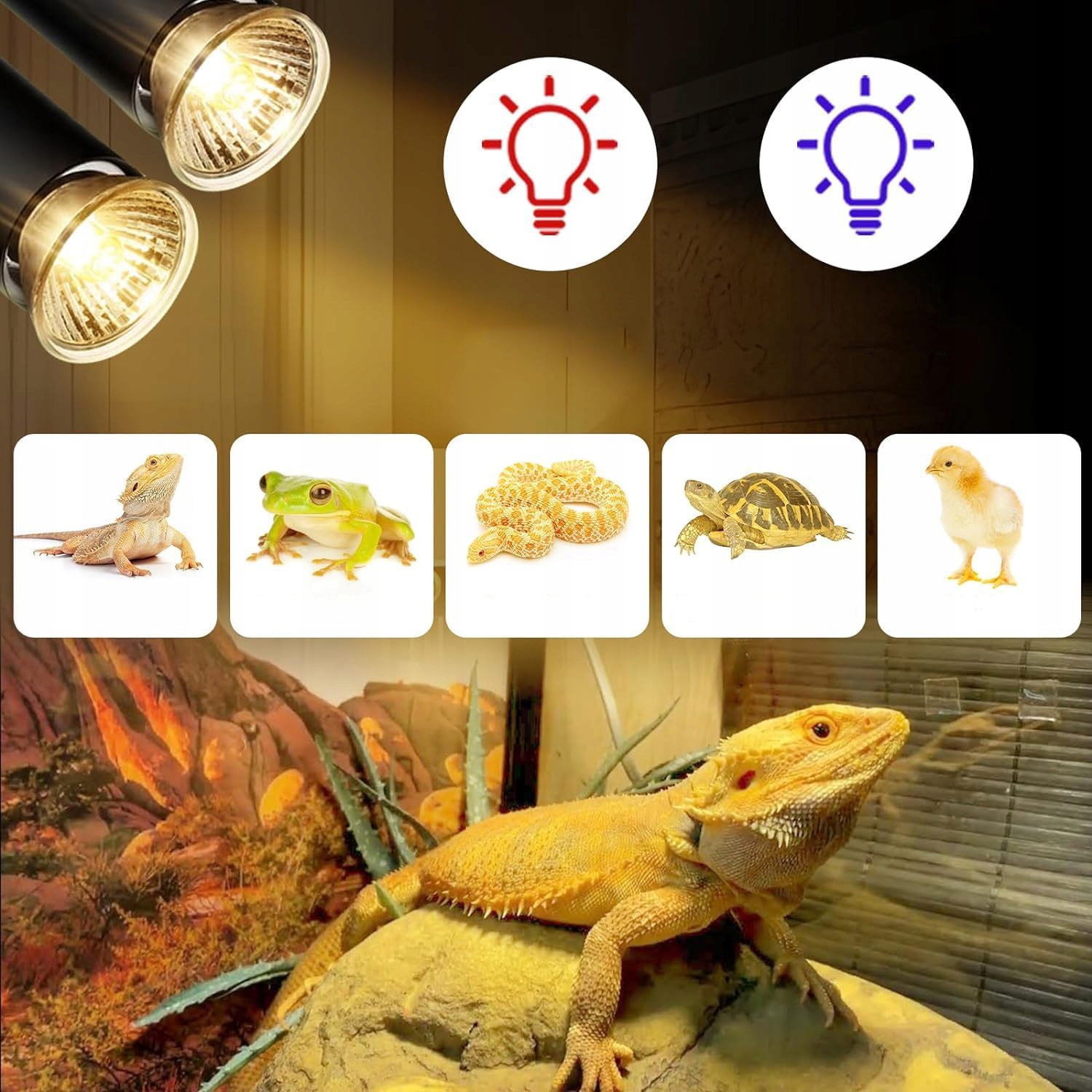 🐢【2 груши для рептилий】 В лампе для рептилий с двойной головкой используется процесс нанесения покрытия, обеспечивающий антиоксидантные и взрывобезопасные свойства. В комплект входит 1 отражатель мощностью 25 Вт и 1 отражатель мощностью 50 Вт. Имитирует солнечный свет и обеспечивает соответствующие ультрафиолетовые лучи и температуру для удовлетворения потребностей рептилий в их естественной среде обитания.