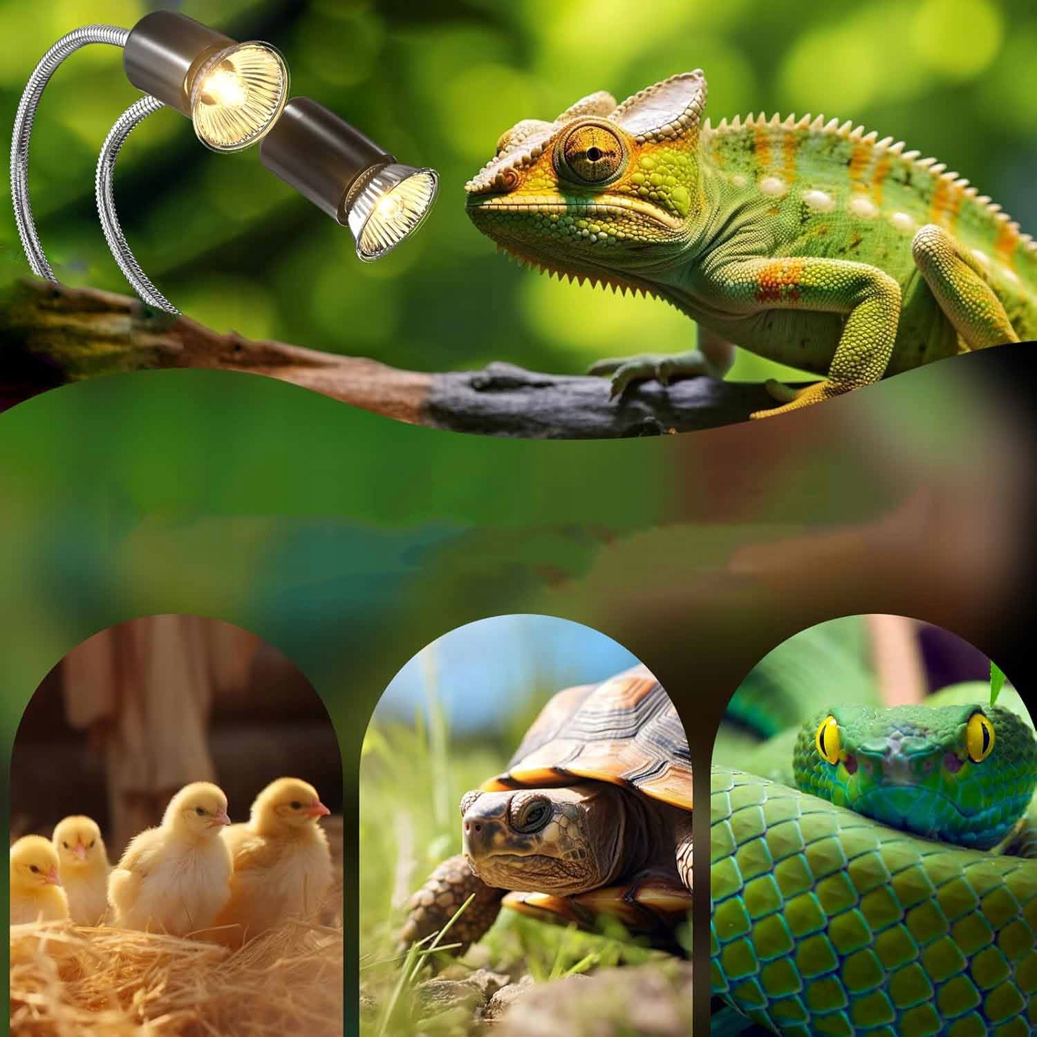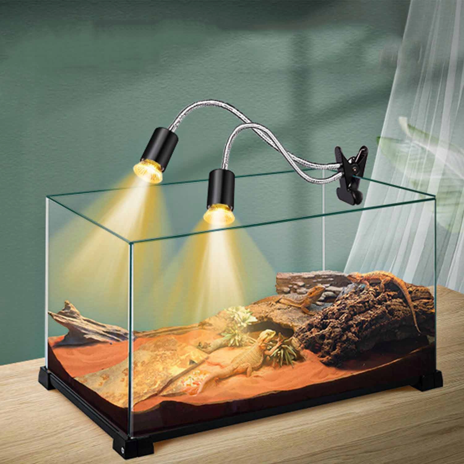 🐢【Имитирует естественный солнечный свет】 Эта нагревательная лампа для рептилий с двумя головками — лучший выбор для разведения рептилий. Он похож на свою естественную среду, где подвергается большему воздействию прямых солнечных лучей. Идеально подходит для большинства рептилий, способствующих здоровому развитию костей рептилий.