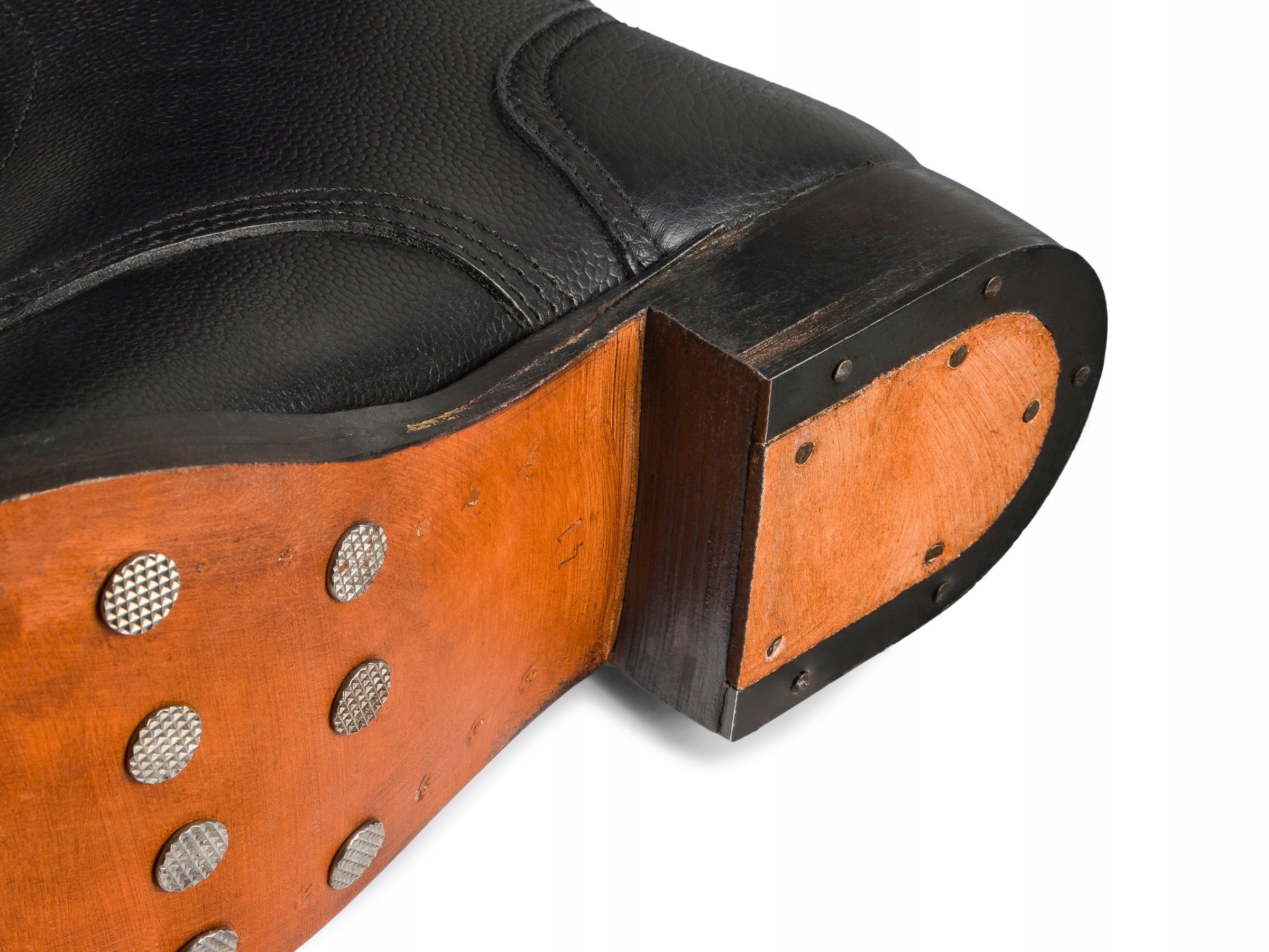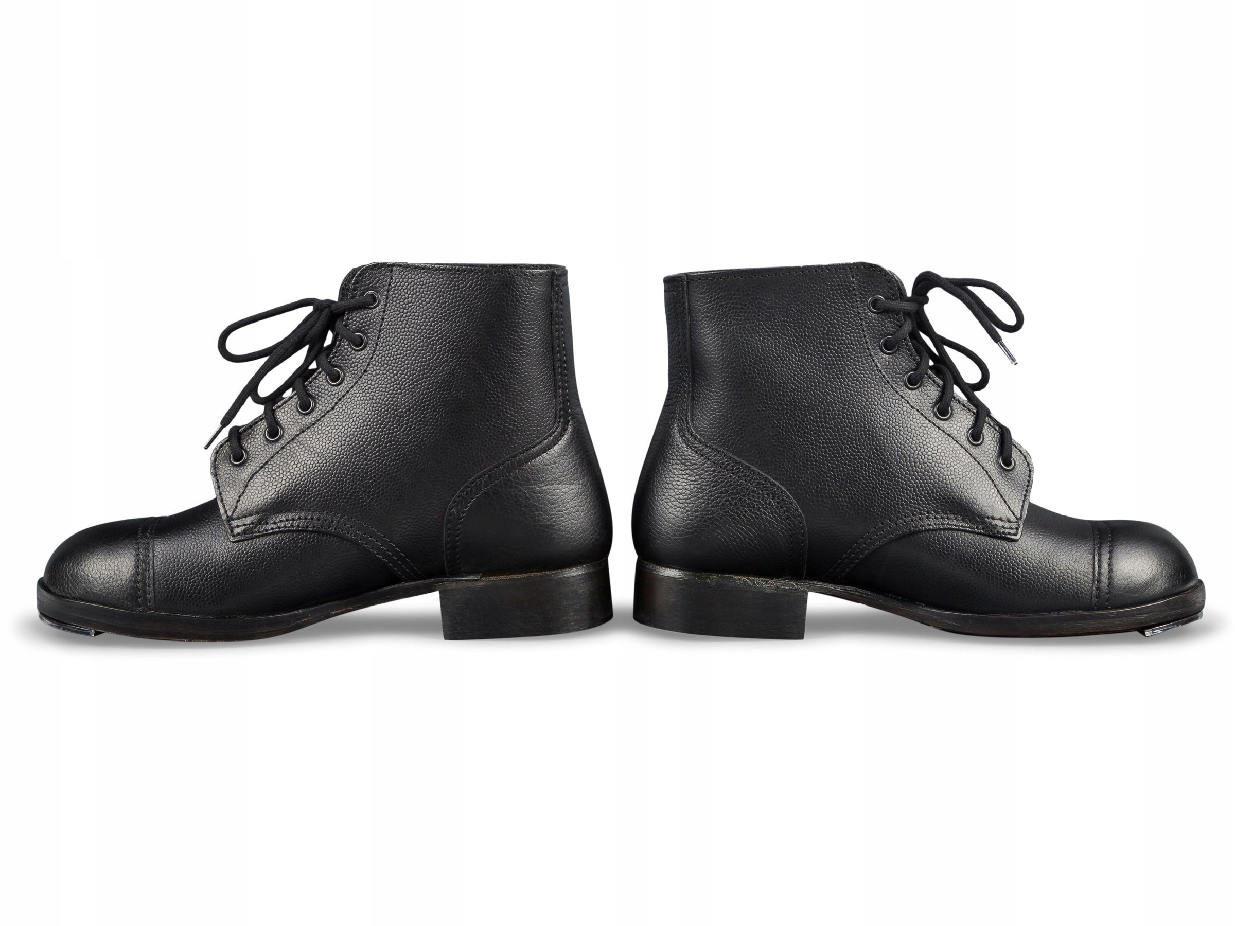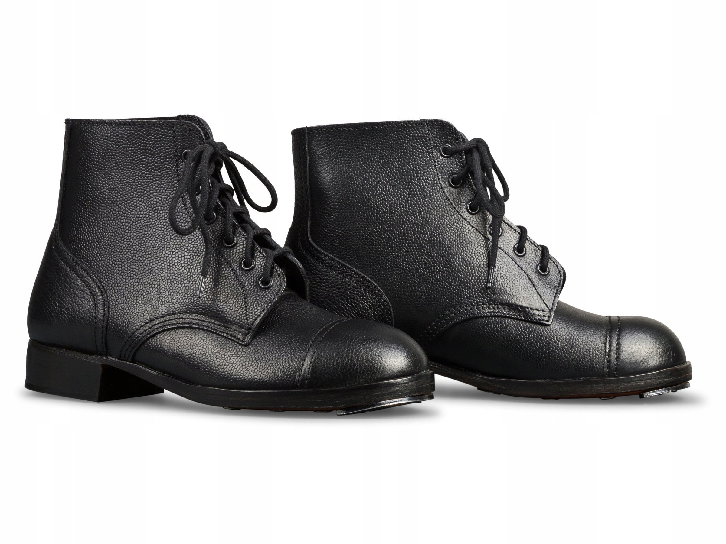 Идеальная копия британских ботинок, широко известных как Ammo Boots. Туфли изготовлены из натуральной зерненой кожи, окрашенной в черный цвет на заводе - в соответствии с оригинальным методом производства. Подошва кожаная, с шипами, обутая соответствующими подковами и правильными для военного периода гвоздями. Это версия, представленная в 1942 году, когда было решено сократить количество гвоздей до 13 штук на одну туфлю.