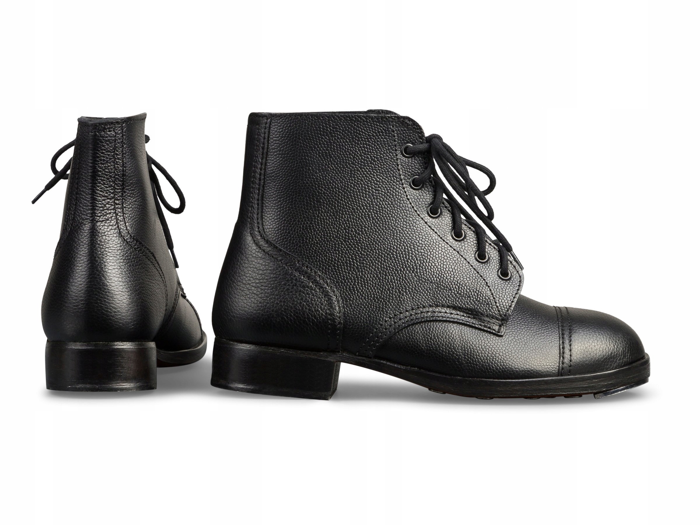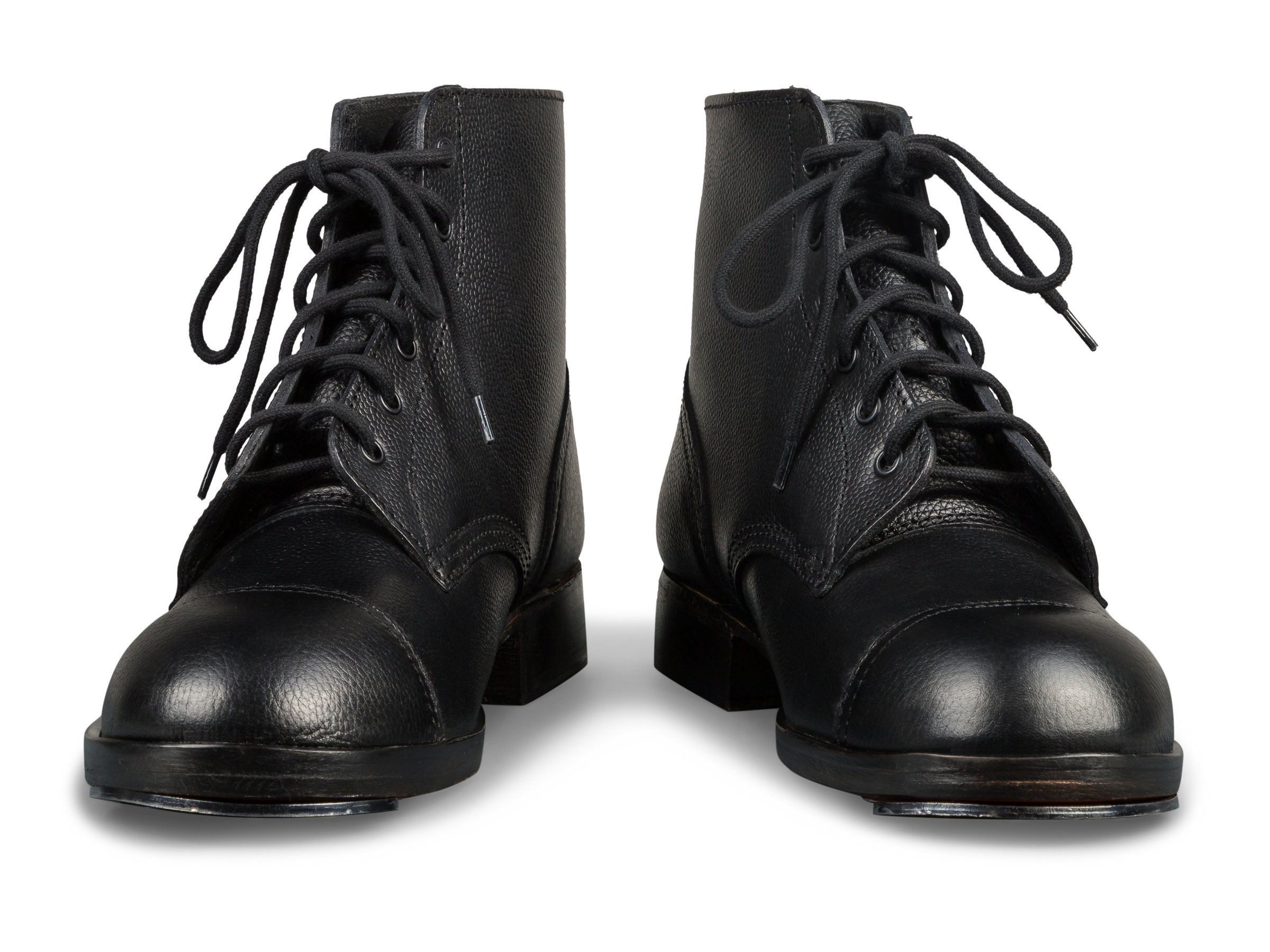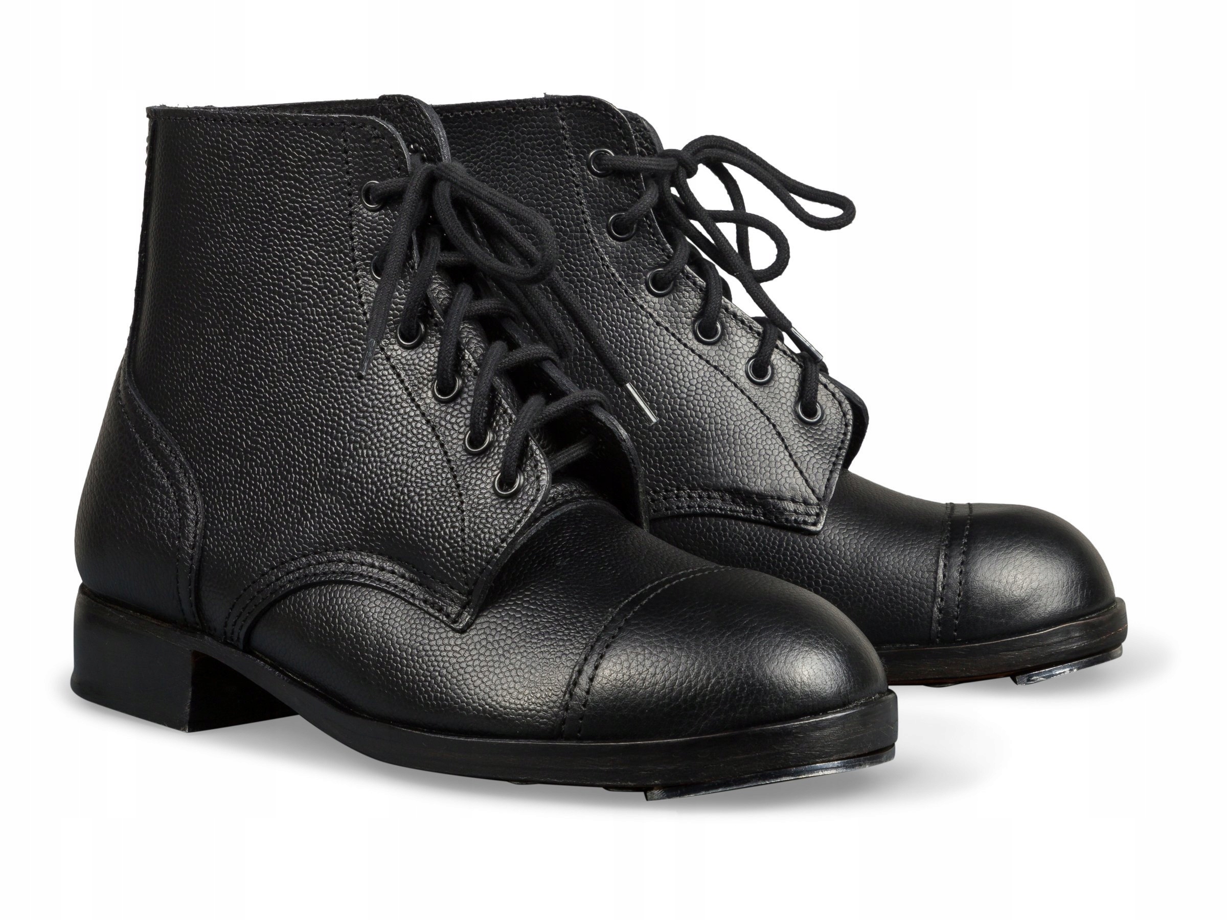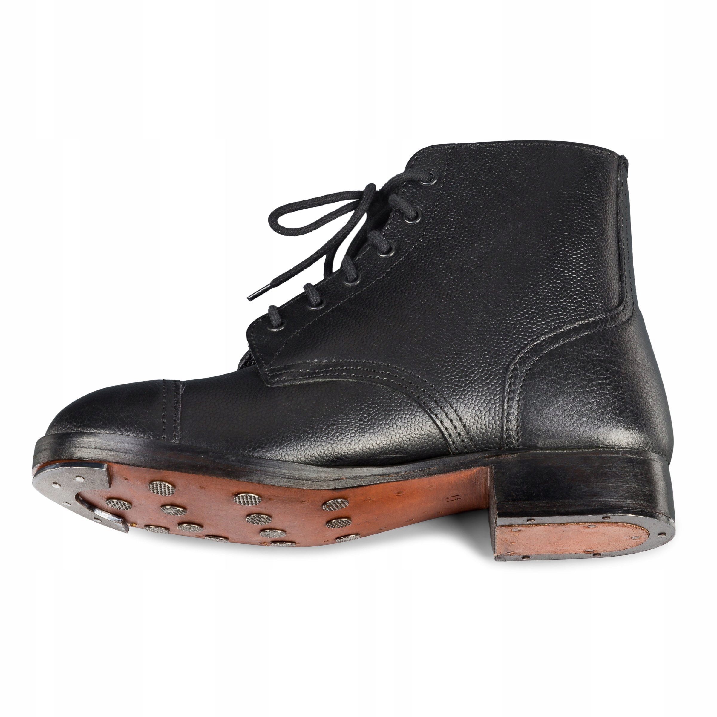 Идеальная копия британских ботинок, широко известных как Ammo Boots. Туфли изготовлены из натуральной зерненой кожи, окрашенной в черный цвет на заводе - в соответствии с оригинальным методом производства. Подошва кожаная, с шипами, обутая соответствующими подковами и правильными для военного периода гвоздями. Это версия, представленная в 1942 году, когда было решено сократить количество гвоздей до 13 штук на одну туфлю.