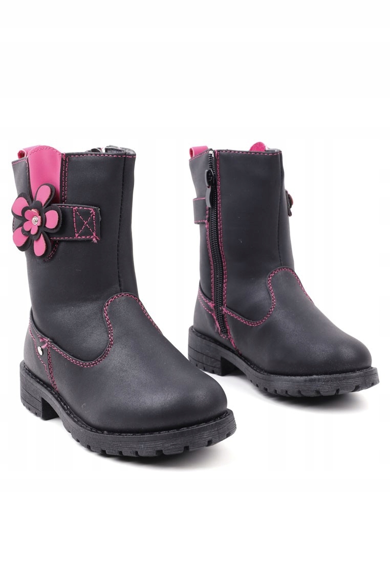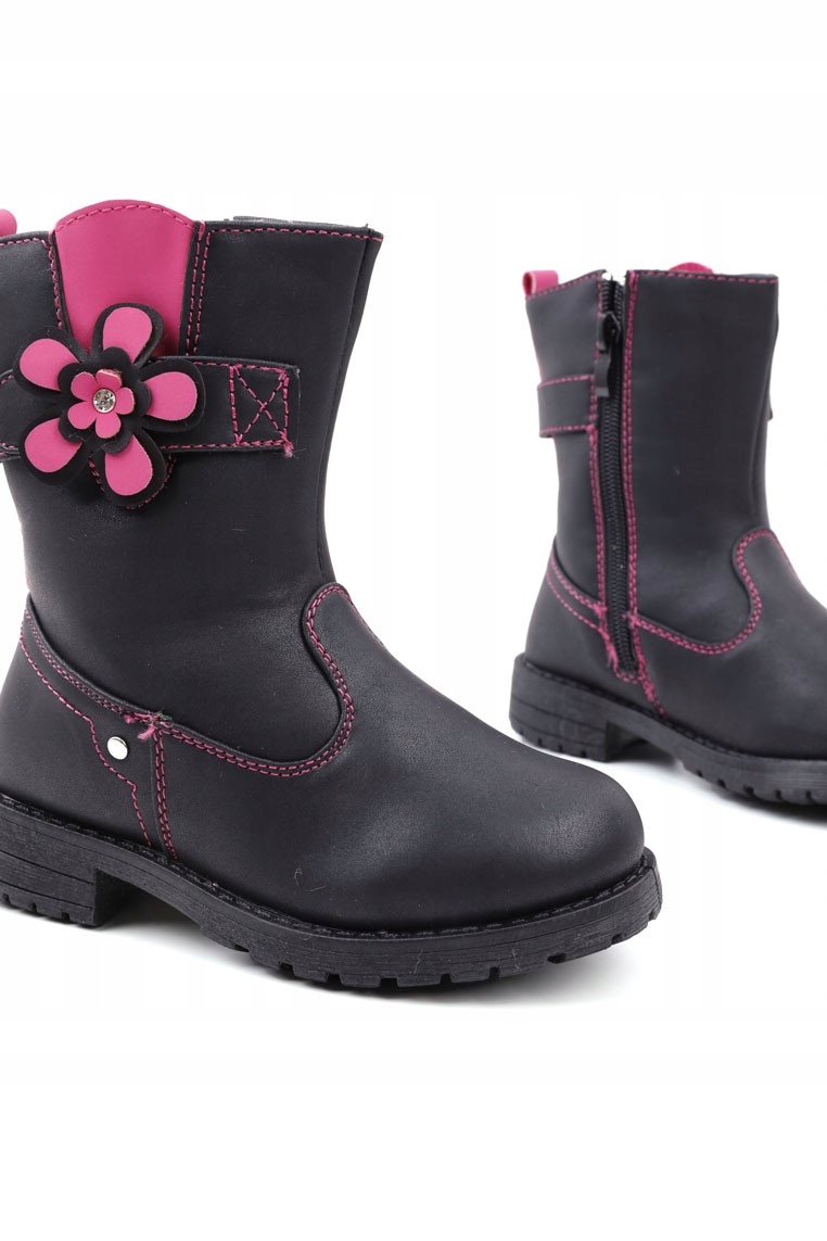 Сапоги для девочек на толстой подошве с маленькой каблуком. Верхняя часть достигает теленка, изготовленного из экологической кожи. Украшен на стороне полосой с розовым цветом. Прикреплен изнутри к молнии. Сильно изолирован с синтетическим пальто овчины. Модный, стильный подходит для многих стилей.