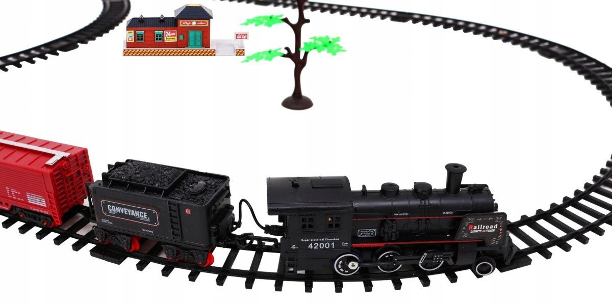 opiskojeka с курящим локомотивом (zkt.19031-2). Маршрут имеет форму эллипса с двумя переключателями и внутренним колесом с размерами ок. 78 см х 156 см. При управлении локомотивом выпускает дым от дымохода, кроме того, свет устанавливается в передней части. использовать. Размеры- локомотив (около 18 x 4,5x 6,5 см),- грузовой повозки (приб. 6,5 см.