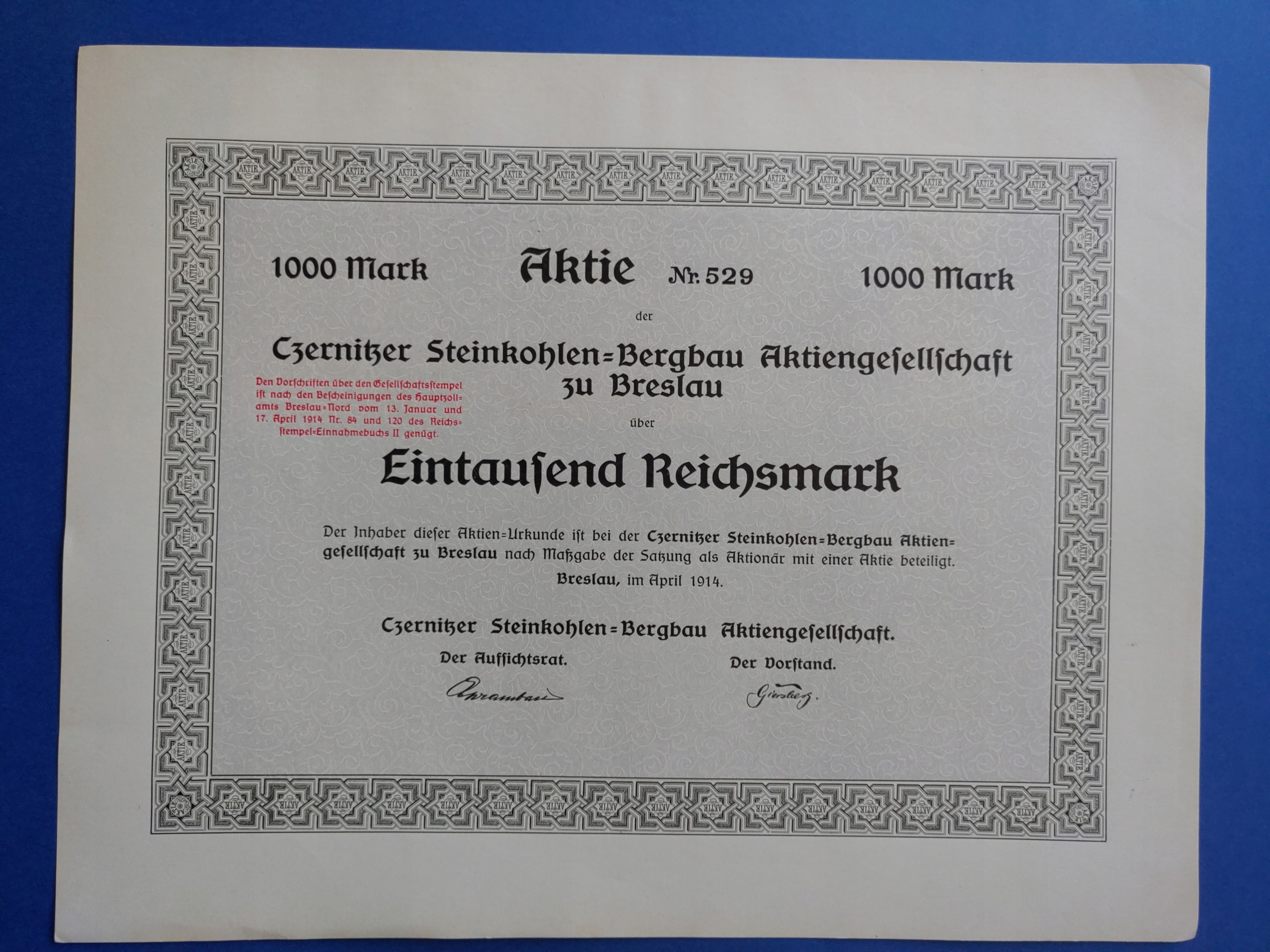 Черніцькі вугільні копальні, акція на 1000 мк 1914 р., з купонами