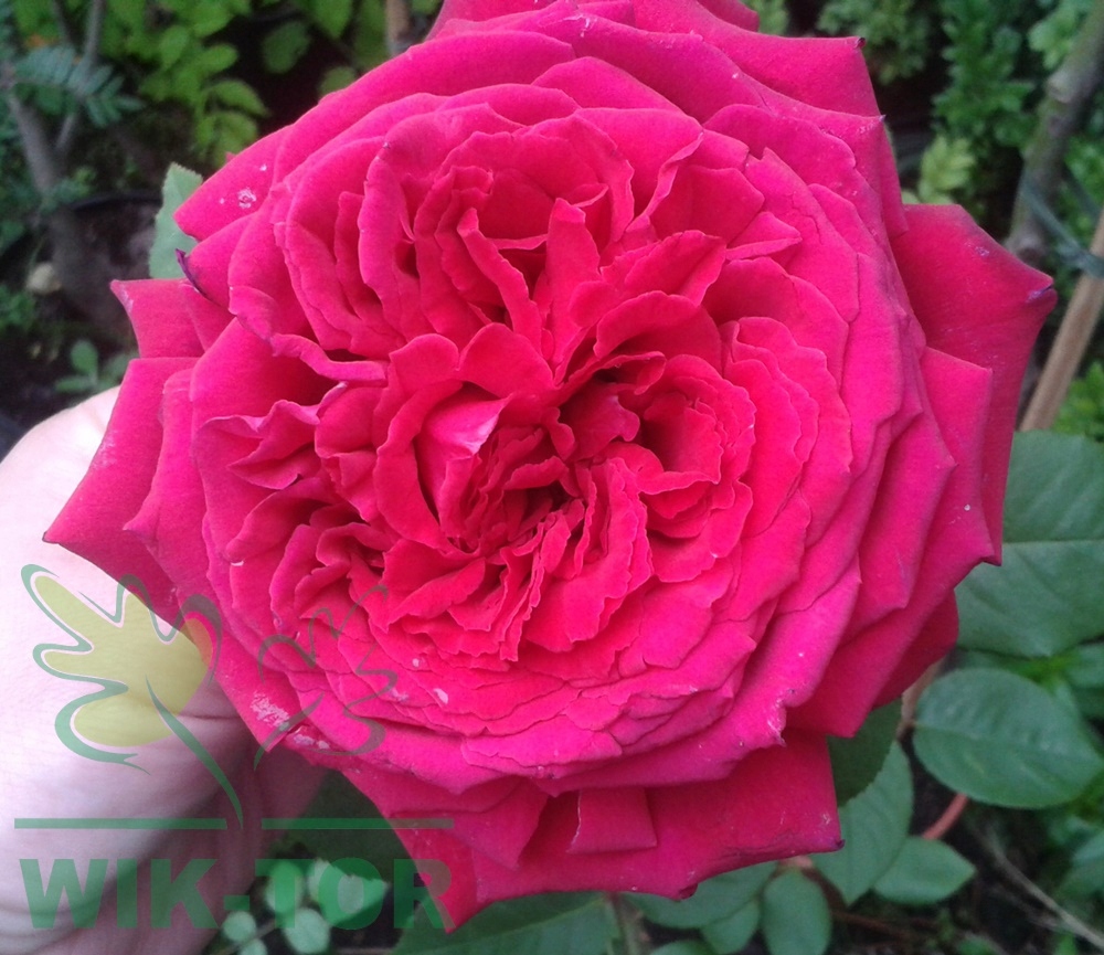 Цветки темно-красные с бархатистыми лепестками, крупные, около 12 см в диаметре, очень пышные. Преимуществом рекомендуемого сорта является его красивый и очень интенсивный аромат. Растение цветет очень долго и обильно, украшая сад до поздней осени. Листья крупные, кожистые, темно-зеленые, блестящие.