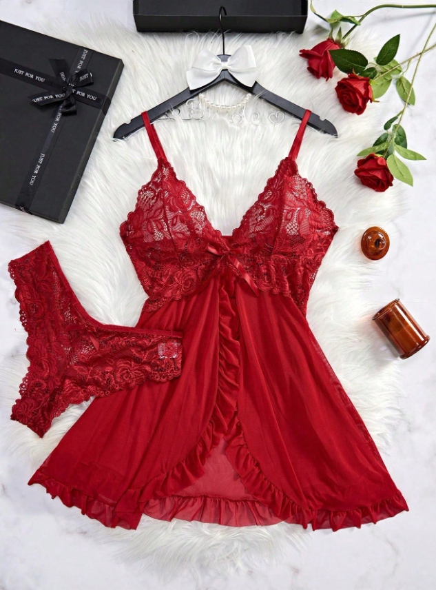 Чувственный, Кружевная Халка в оттенке красной розы с излишеств, лука и трусики на съемочной площадке - идеально подходит для романтических ночей.