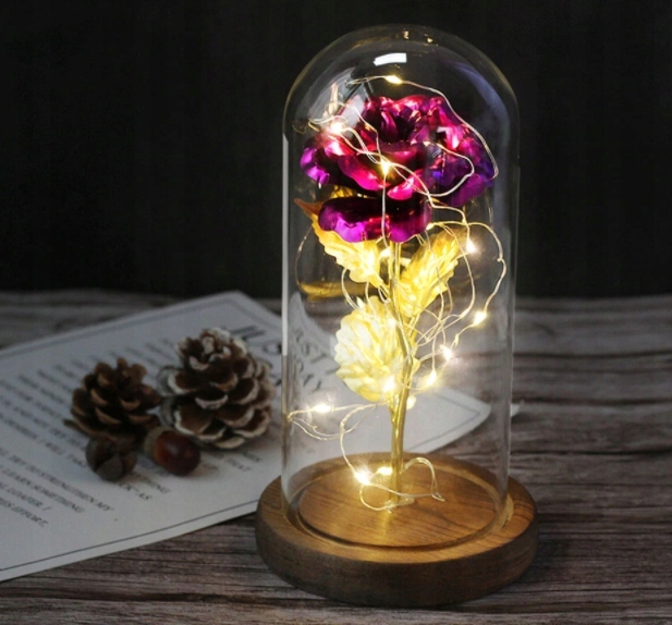 КРАСНАЯ ЗОЛОТАЯ ВЕЧНАЯ РОЗА ПОД АБАЖУРОМ ЦВЕТОК LED