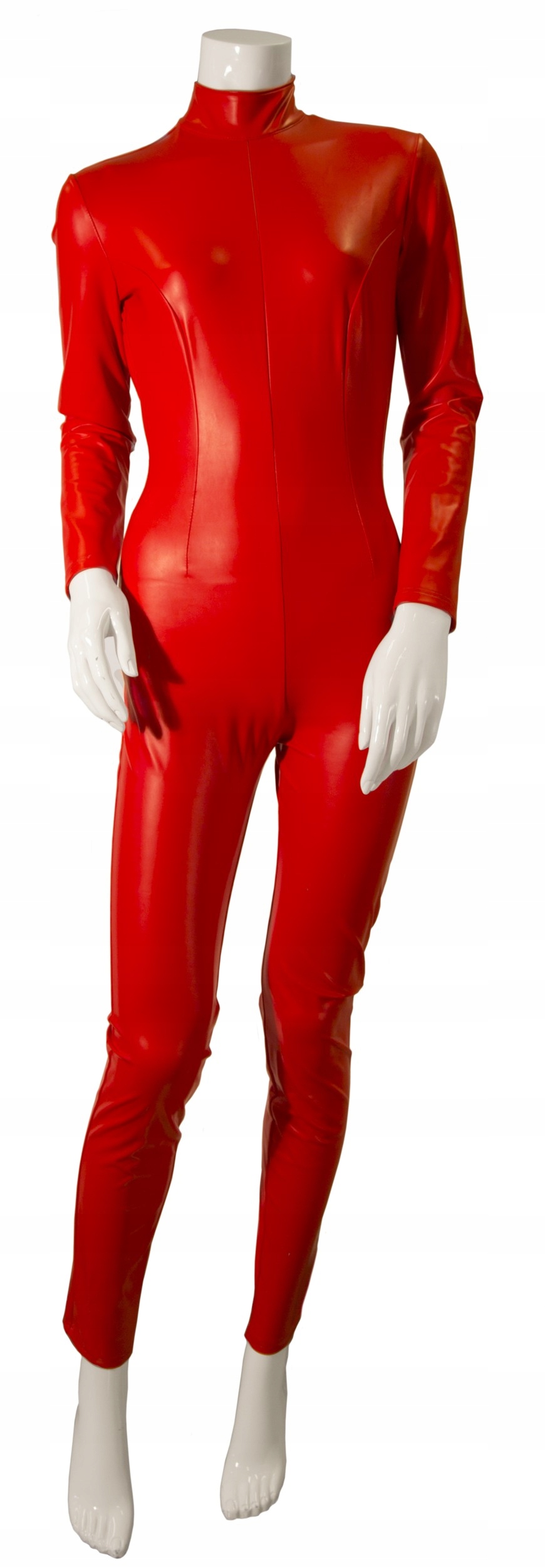 Красный комбинезон из латекса, внутри имеет мягкую подкладку из эластичной ткани, благодаря чему материал не прилипает к коже и костюм легко надевается без использования специализированных порошков и масел.