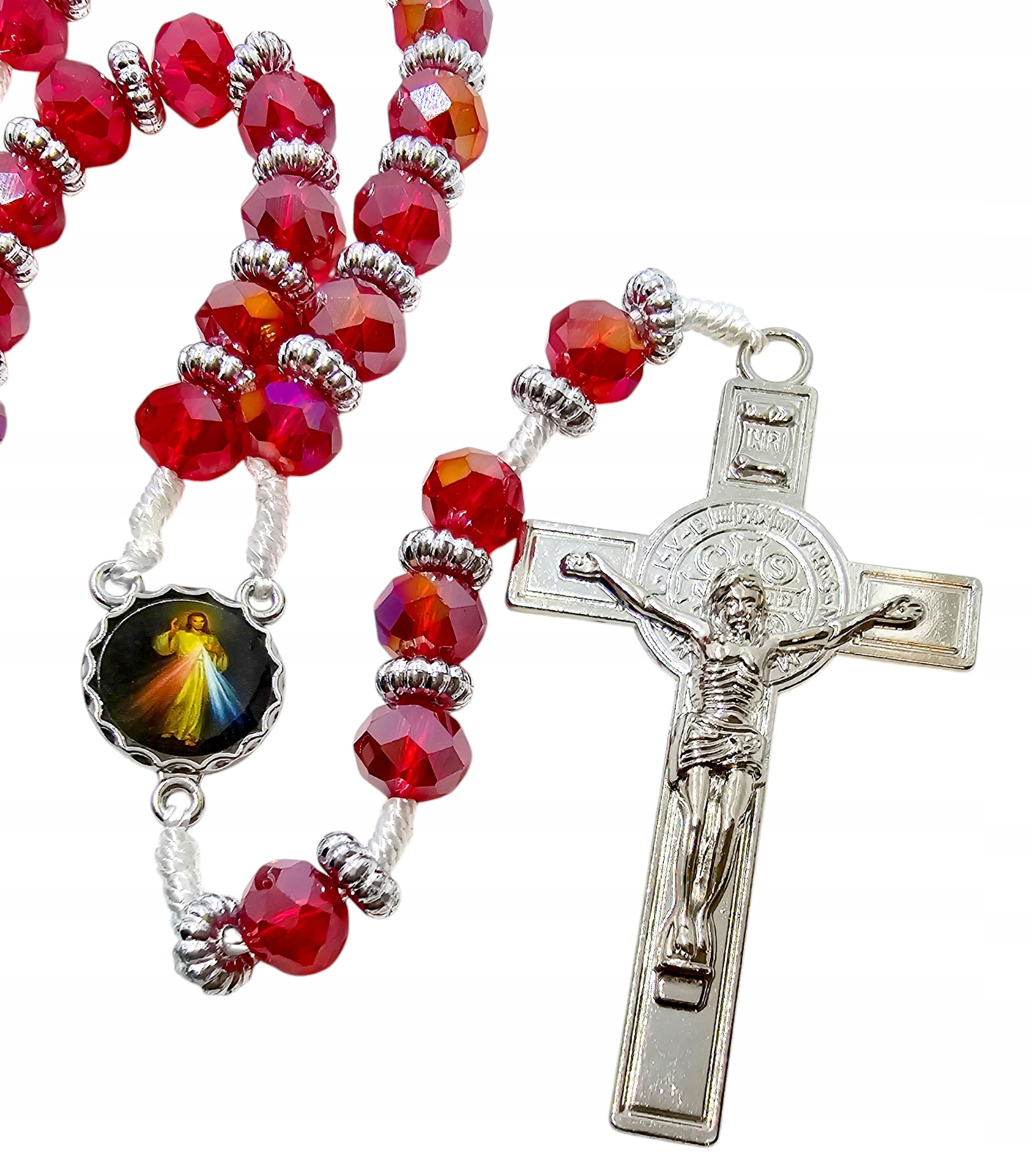 Откройте для себя красоту и глубину молитвы с помощью наших уникальных четок из красного хрусталя. Изготовлен из привлекательных стеклянных бусин диаметром 10 мм, которые прекрасно отражают свет. Каждую декаду четок отделяет металлический медальон с изображением Иисуса Милосердного с картины святой Фаустины Ковальской «Иисус, я верю в Тебя». Кроме того, каждая хрустальная бусина декорирована и отделена друг от друга небольшим серебряным пластиковым элементом, что придает ей уникальный характер. Четки длиной 52 см увенчаны металлическим крестом размером 68х40 мм. Все это сделано из прочной веревки. Это элегантные и наполненные духовным смыслом четки, идеальные для повседневной молитвы и в качестве уникального подарка.