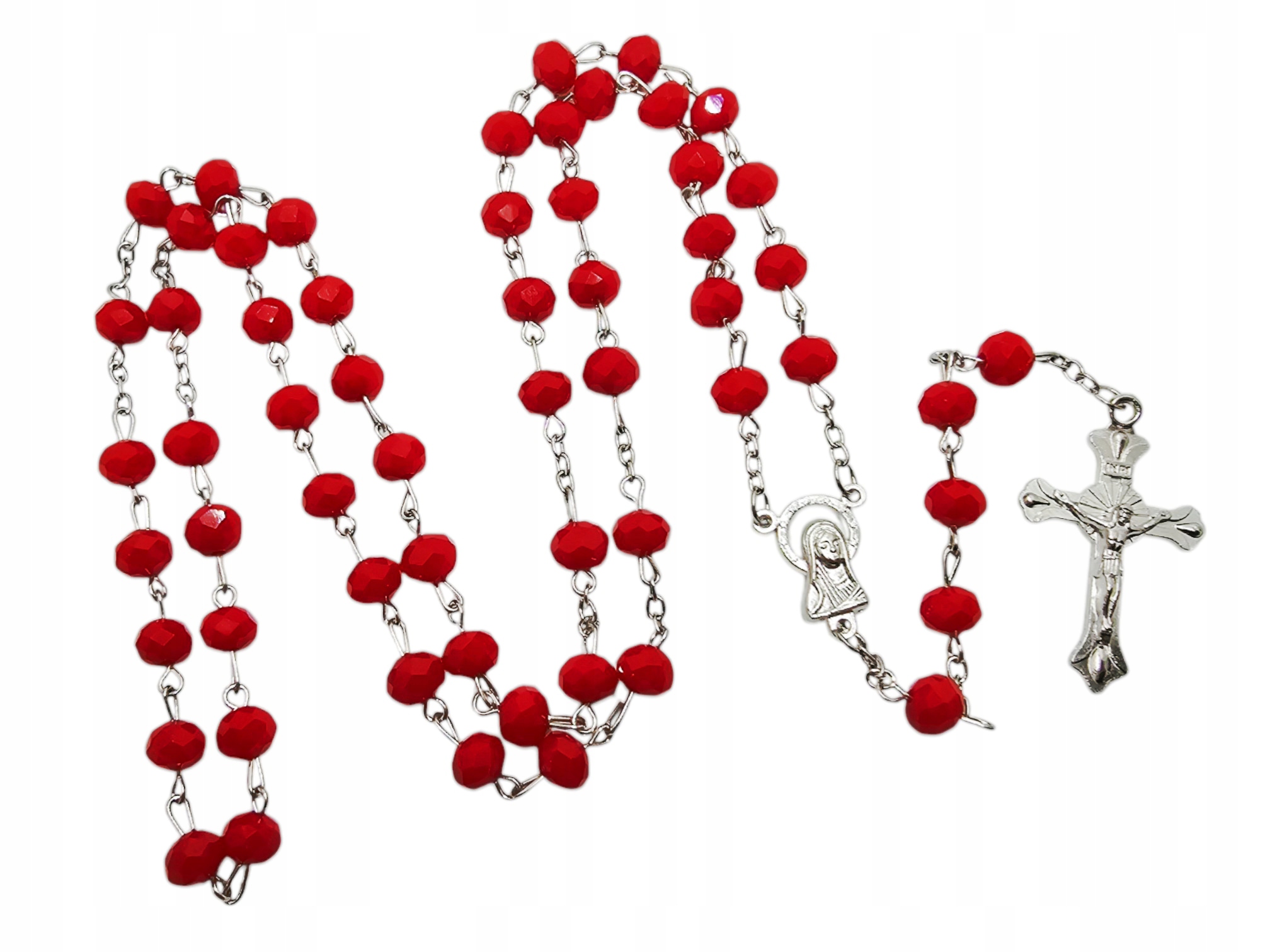 Розарий длиной 48 см, а окружность 66 см, что позволяет удерживать в руке во время молитвы. Он состоит из 6 -мм шаров, которые, благодаря их порезам, красиво отражают свет, создавая эффективный блеск. Глубокий красный цвет бусин символизирует любовь, жертву и Святой Дух, который добавляет дополнительное духовное измерение к четки.