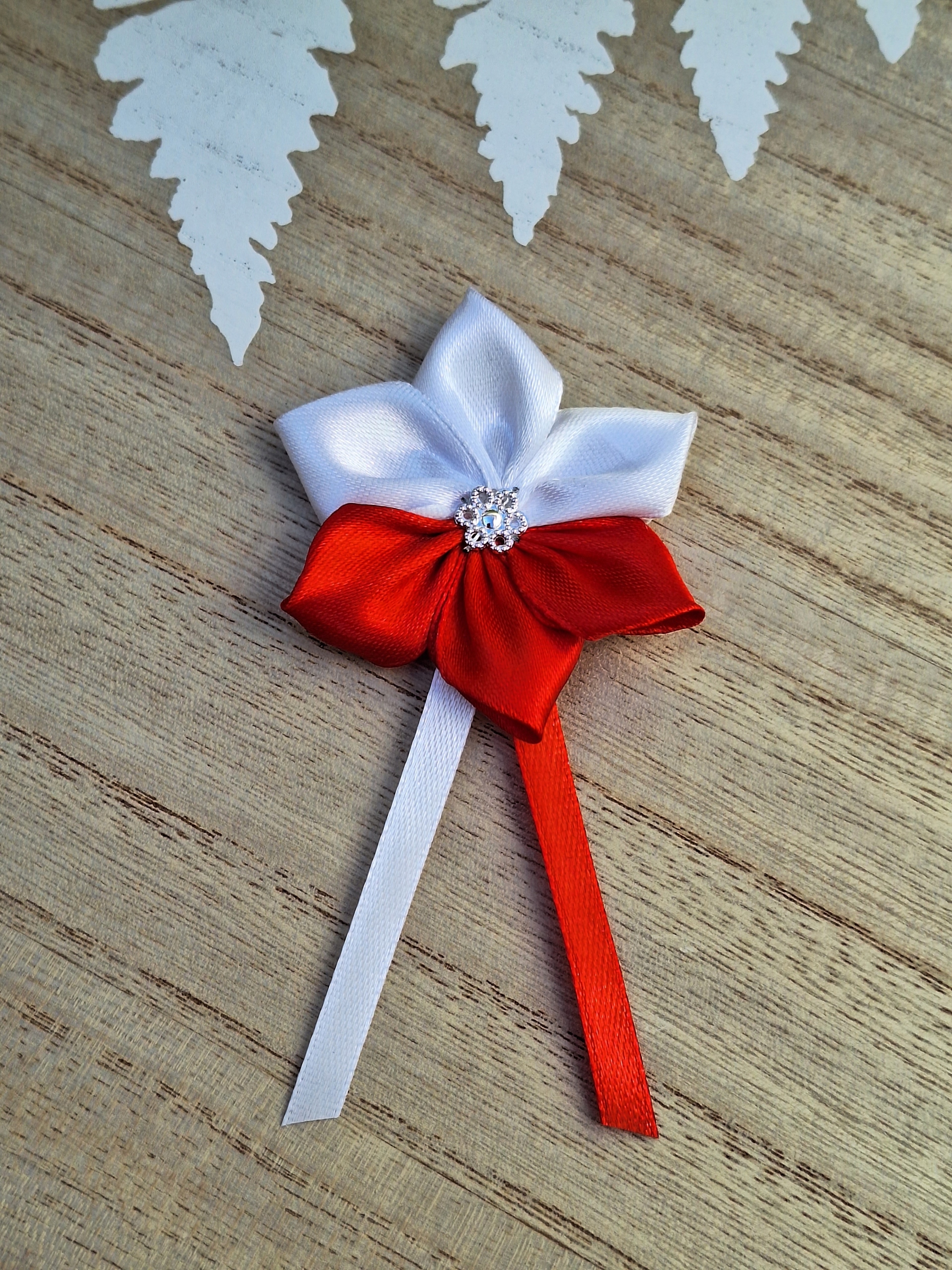 Выполнен из атласных лент и закреплен булавкой, прикрепленной к котильону.