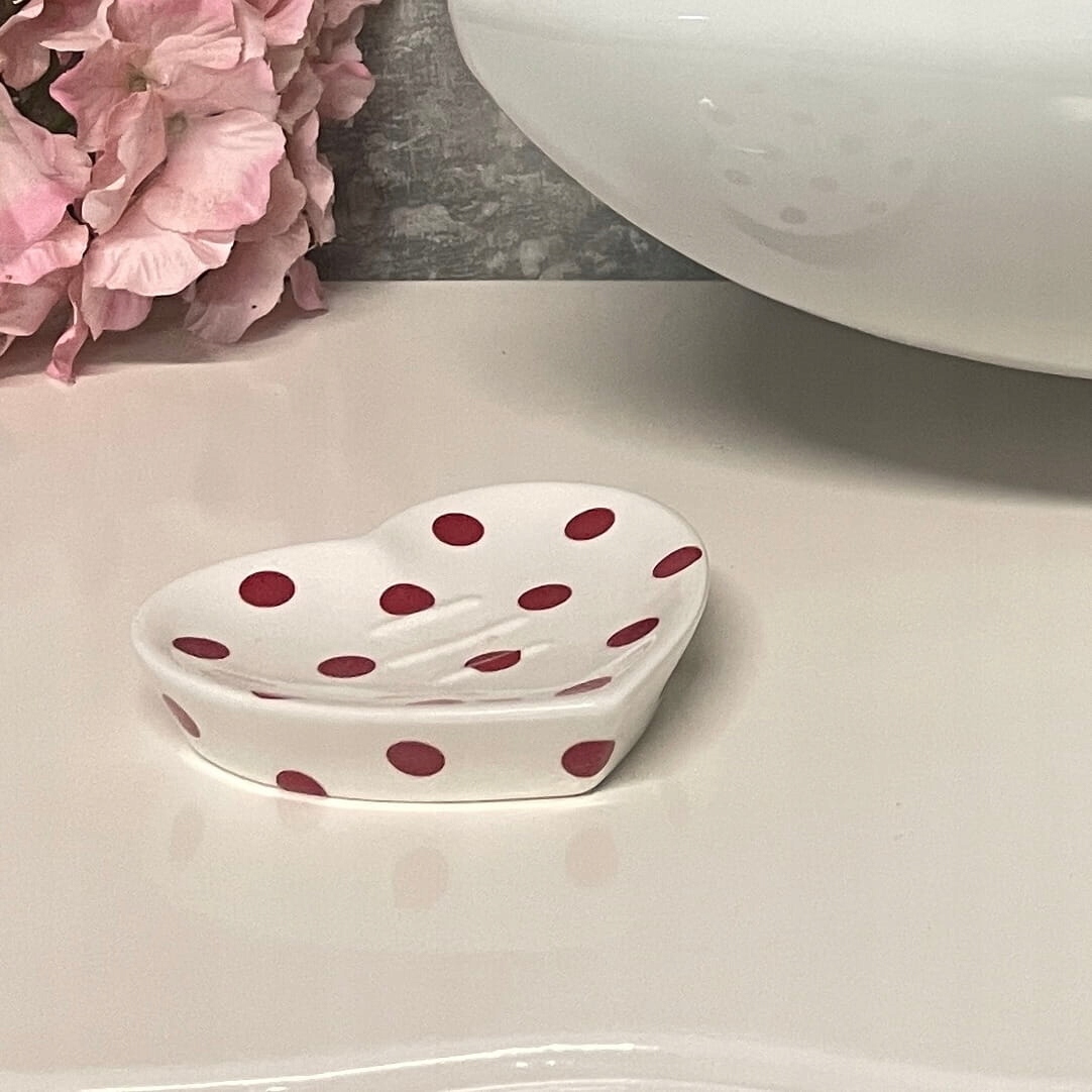 Фарфоровый гарнитур для ванной комнаты белого и красного цвета в горошек